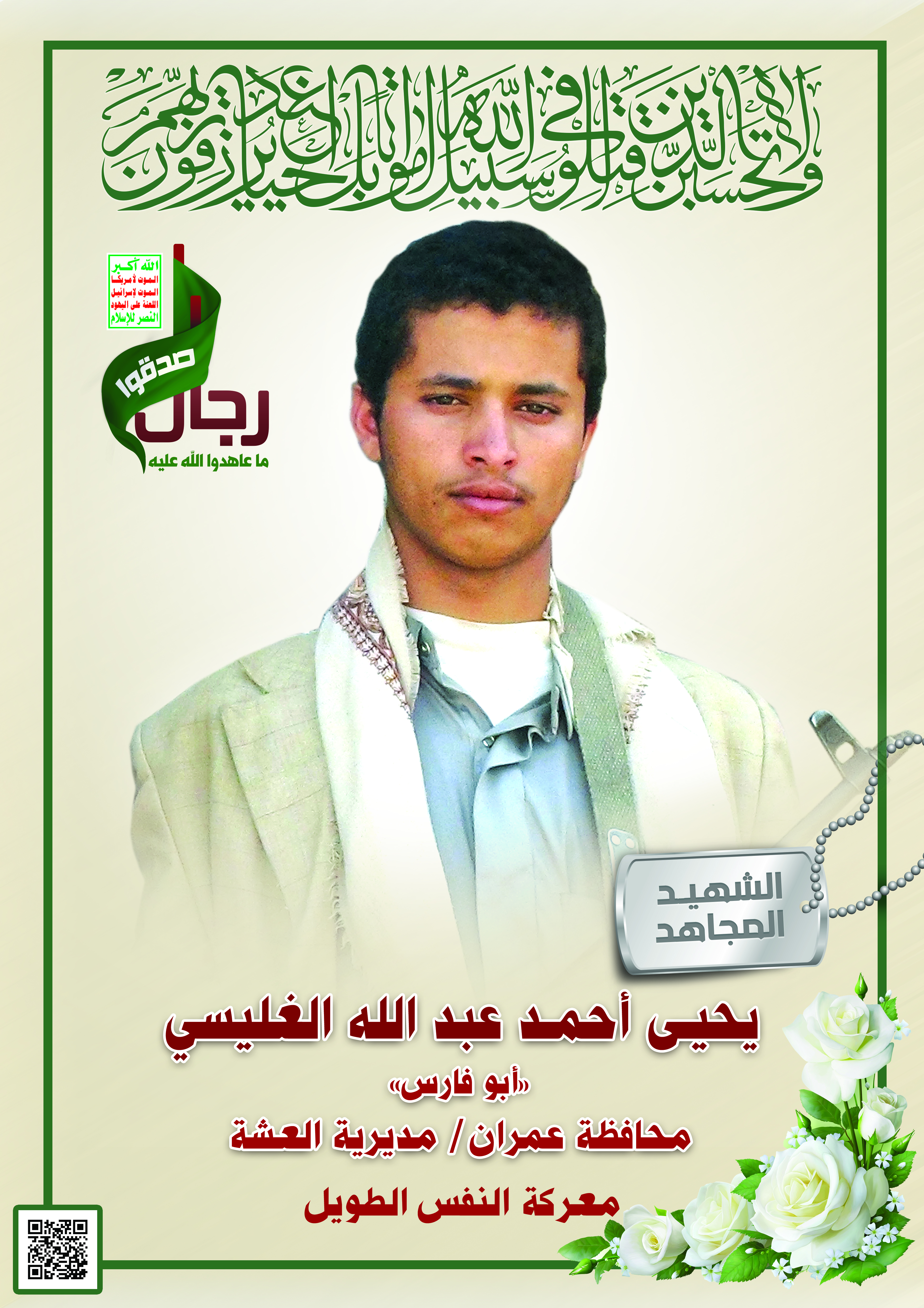 Actor يحيى أحمد عبدالله مانع الغليسي Filmography الشهيد المجاهد: يحيى أحمد عبدالله مانع الغليسي – أبو فارس المحافظة: عمران المديرية: العشة – السواد معركة النفس الطويل رقم الحافظة: 123230