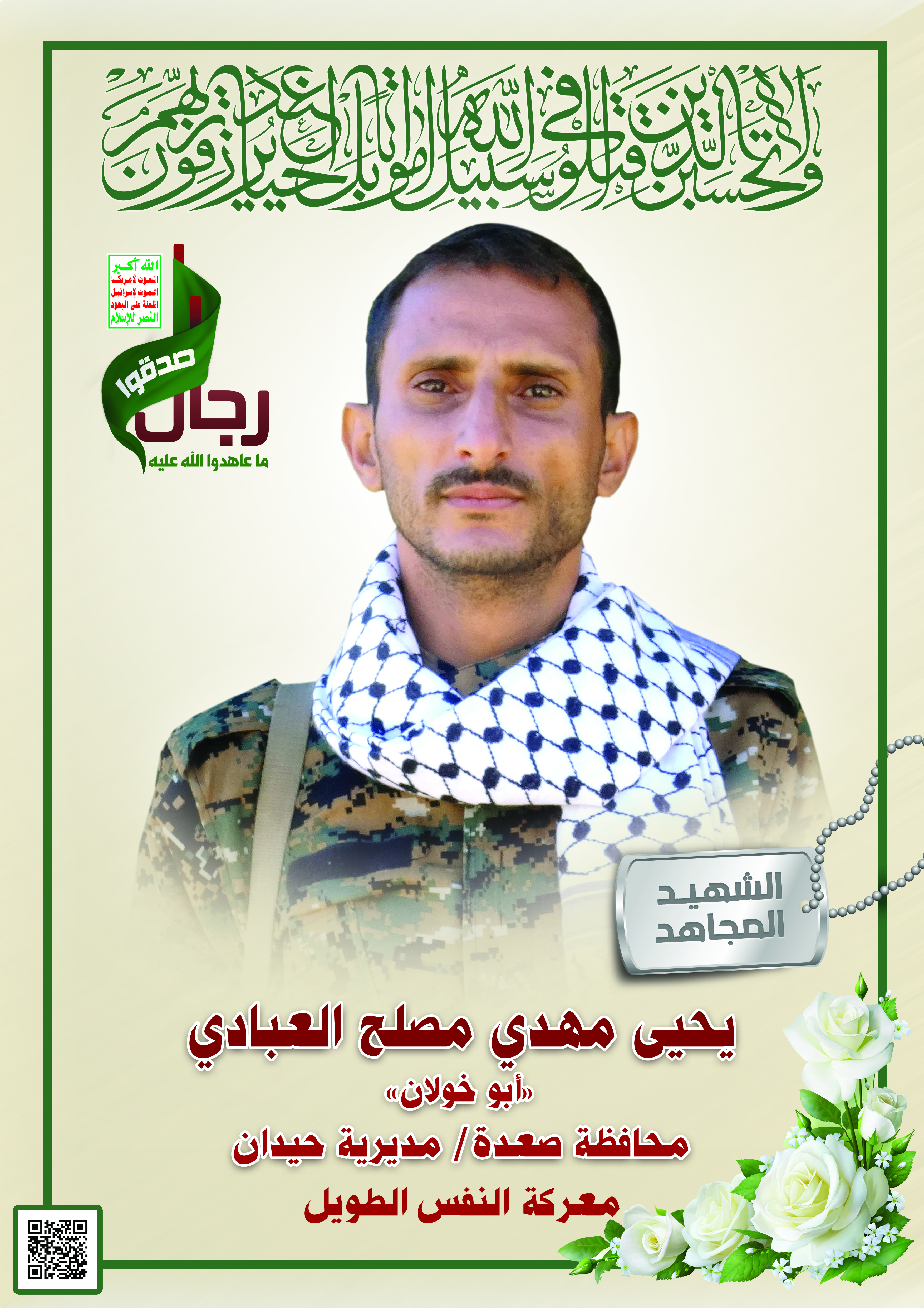 Actor يحيى مهدي مصلح العبادي Filmography الشهيد المجاهد: يحيى مهدي مصلح العبادي – أبو خولان المحافظة: صعدة المديرية: حيدان – ذويب معركة النفس الطويل رقم الحافظة: 123237