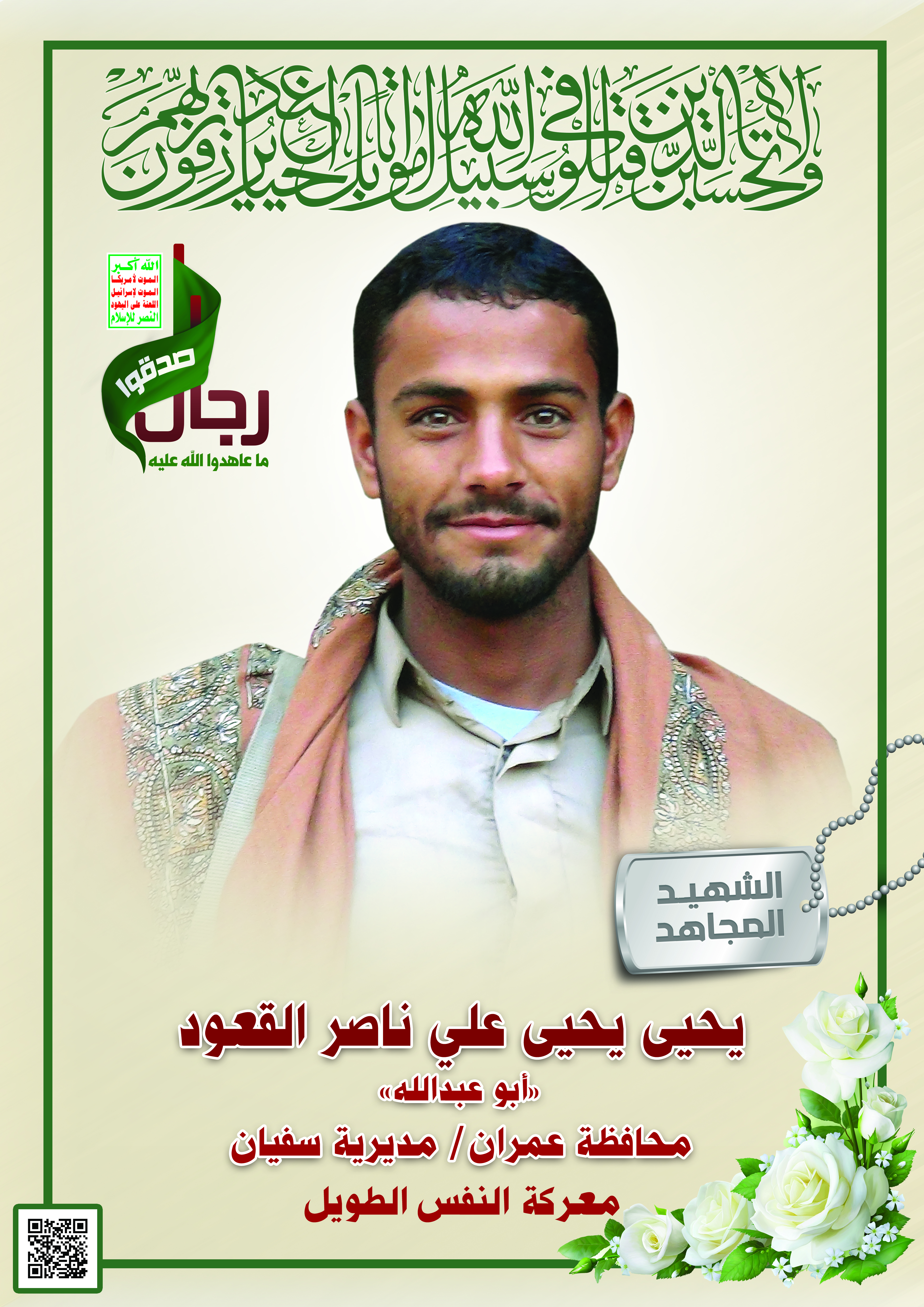 Actor يحيى يحيى علي ناصر القعود Filmography الشهيد المجاهد: يحيى يحيى علي ناصر القعود – أبو عبدالله المحافظة: عمران المديرية: سفيان – سحبل معركة النفس الطويل رقم الحافظة: 123238 FILMOGRAPHY icon بل أحياء – الشهيد يحيى يحيى القعود (أبو عبد الله) 31/12/2021 icon يحيى يحيى علي ناصر القعود “أبو عبدالله” 08/07/2016 23/11/2021