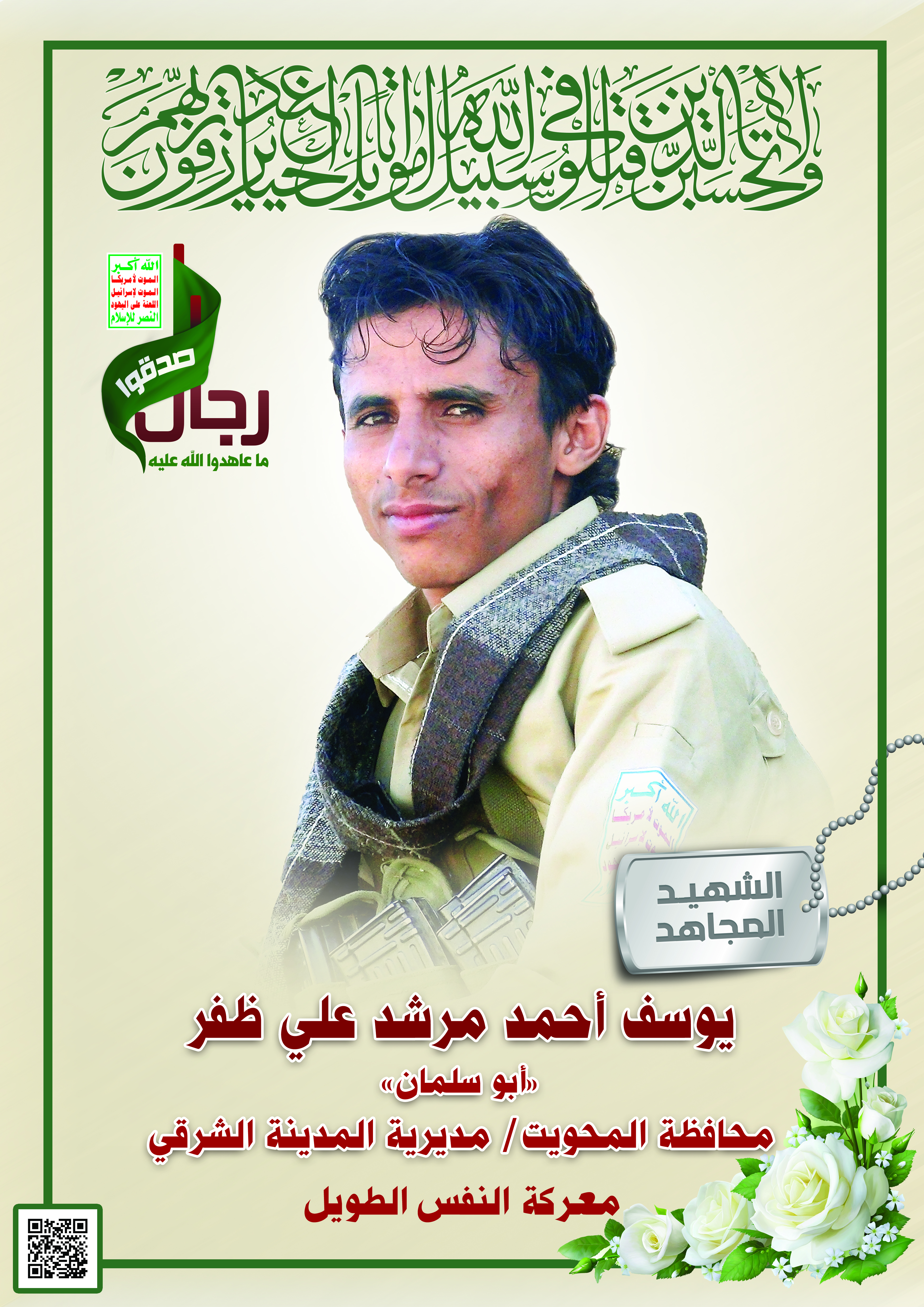 Actor يوسف أحمد مرشد علي ظفر Filmography الشهيد المجاهد: يوسف أحمد مرشد علي ظفر – أبو سلمان المحافظة: المحويت المديرية: المدينة الشرقي – معركة النفس الطويل رقم الحافظة: 123239