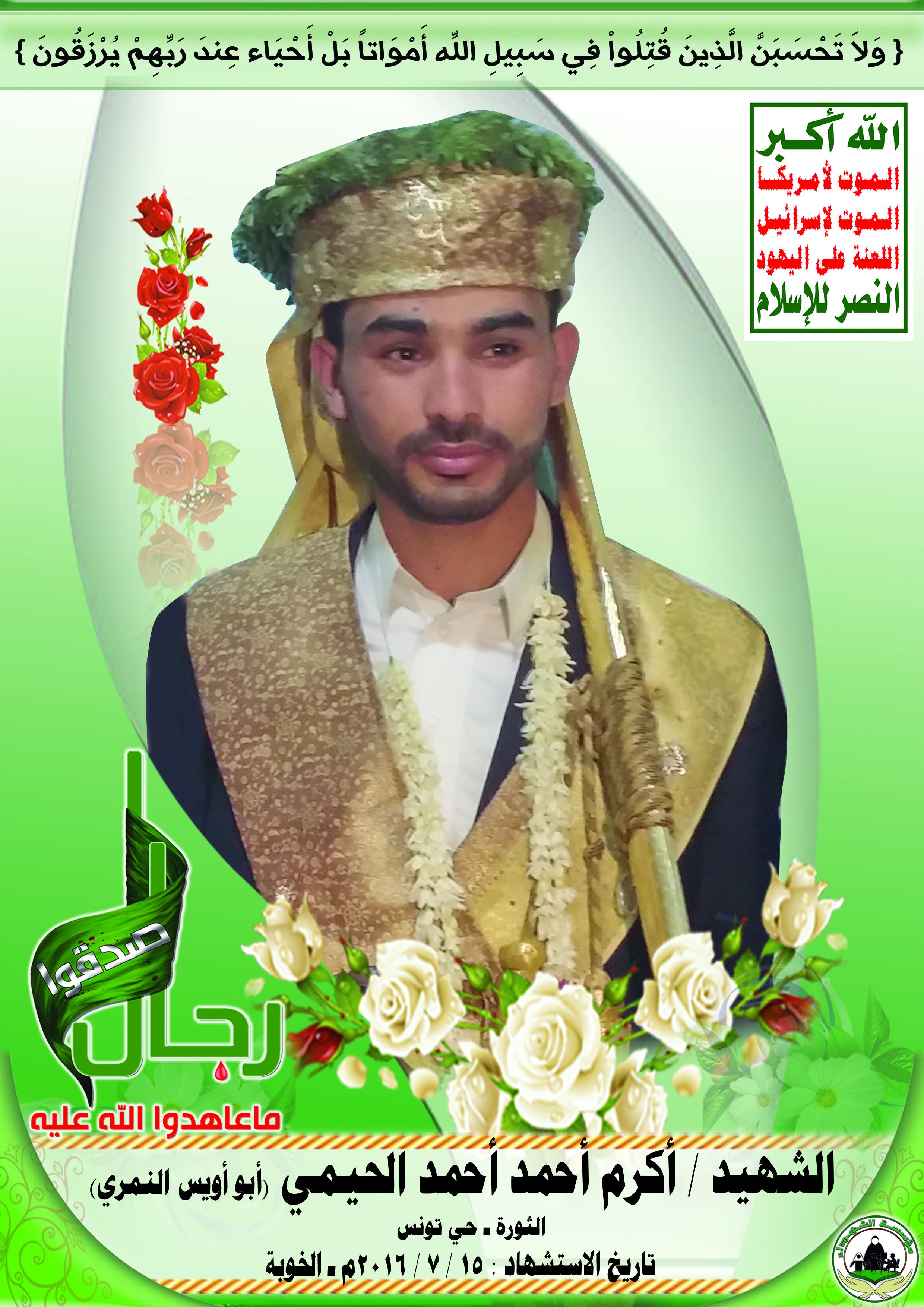 Actor أكرم أحمد أحمد الحيمي Filmography الشهيد المجاهد: أكرم أحمد أحمد الحيمي – أبو أويس المحافظة: الأمانة المديرية: الثورة ش تونس – معركة النفس الطويل رقم الحافظة: 123318