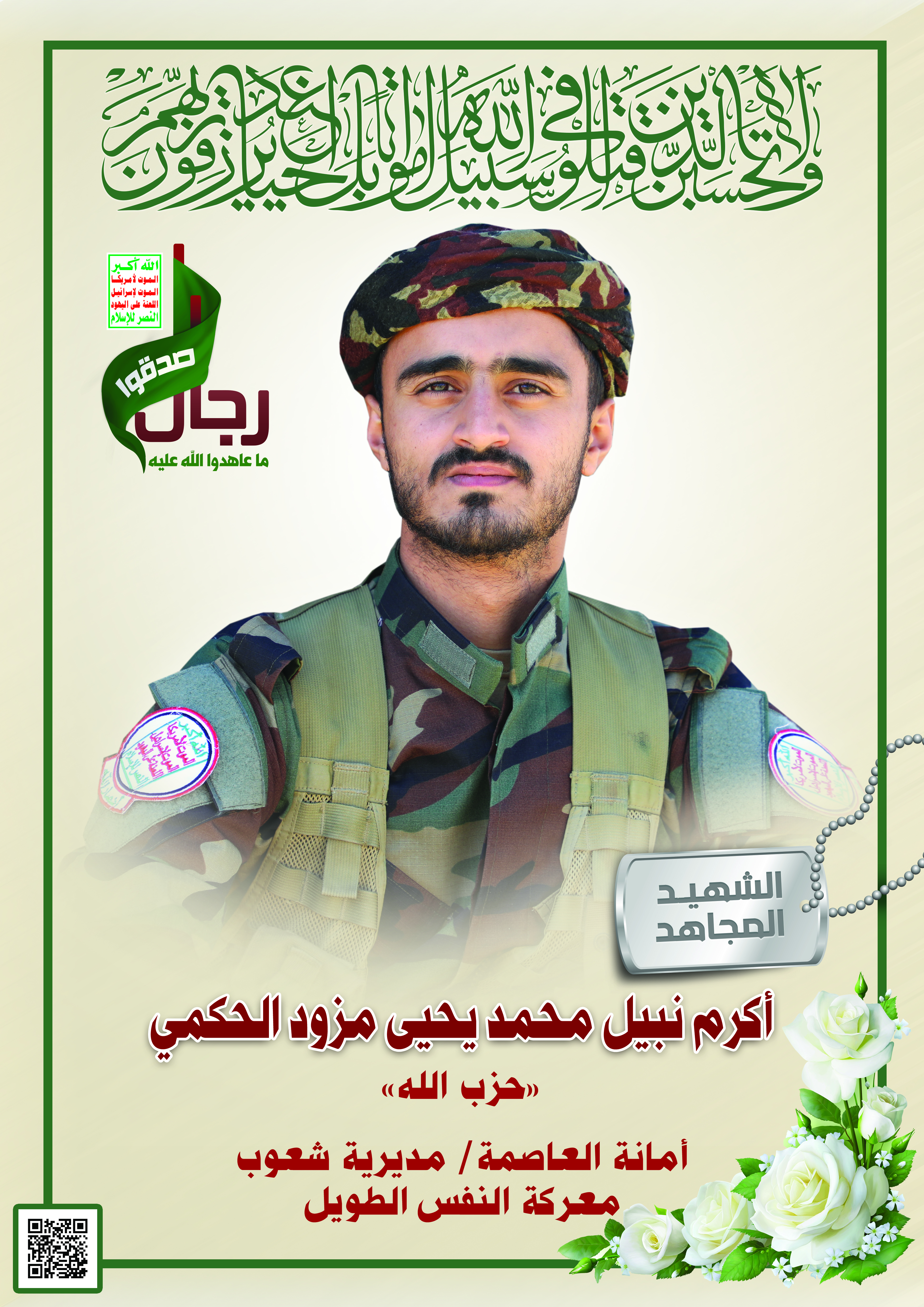 Actor أكرم نبيل محمد يحيى مزود الحكمي Filmography الشهيد المجاهد: أكرم نبيل محمد يحيى مزود الحكمي – أبو حزب الله المحافظة: الأمانة المديرية: شعوب – معركة النفس الطويل رقم الحافظة: 123322 FILMOGRAPHY icon نشيد الشوق | فرقة الشهيد القائد – 1444هـ 11/12/2022 11/12/2022 icon مونتاج زامل درب الشهادة | أداء/ لطف القحوم & عيسى الليث – 1441هـ 29/12/2020 18/12/2021 icon لكم الخلود – الشهيد المجاهد أكرم نبيل محمد يحيى مزود الحكمي (أبو حزب) 15/11/2020 24/11/2021