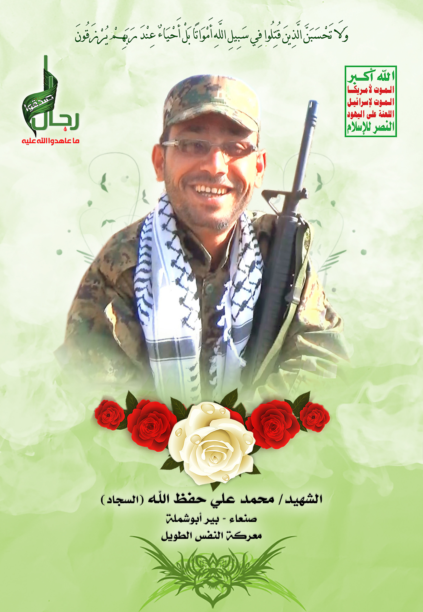 Actor محمد علي علي أحمد حفظ الله Filmography الشهيد المجاهد: محمد علي علي أحمد حفظ الله – أبو سجاد المحافظة: الأمانة المديرية: الثورة بير أبو شملة – معركة النفس الطويل رقم الحافظة: 123600 FILMOGRAPHY icon وصايا الخالدين || الشهيد/محمد علي علي حفظ الله (أبو سجاد) 06/02/2023 icon فلاشة وصايا الخالدين – محمد علي علي احمد حفظ الله – أبو سجاد 12/01/2020 24/11/2021