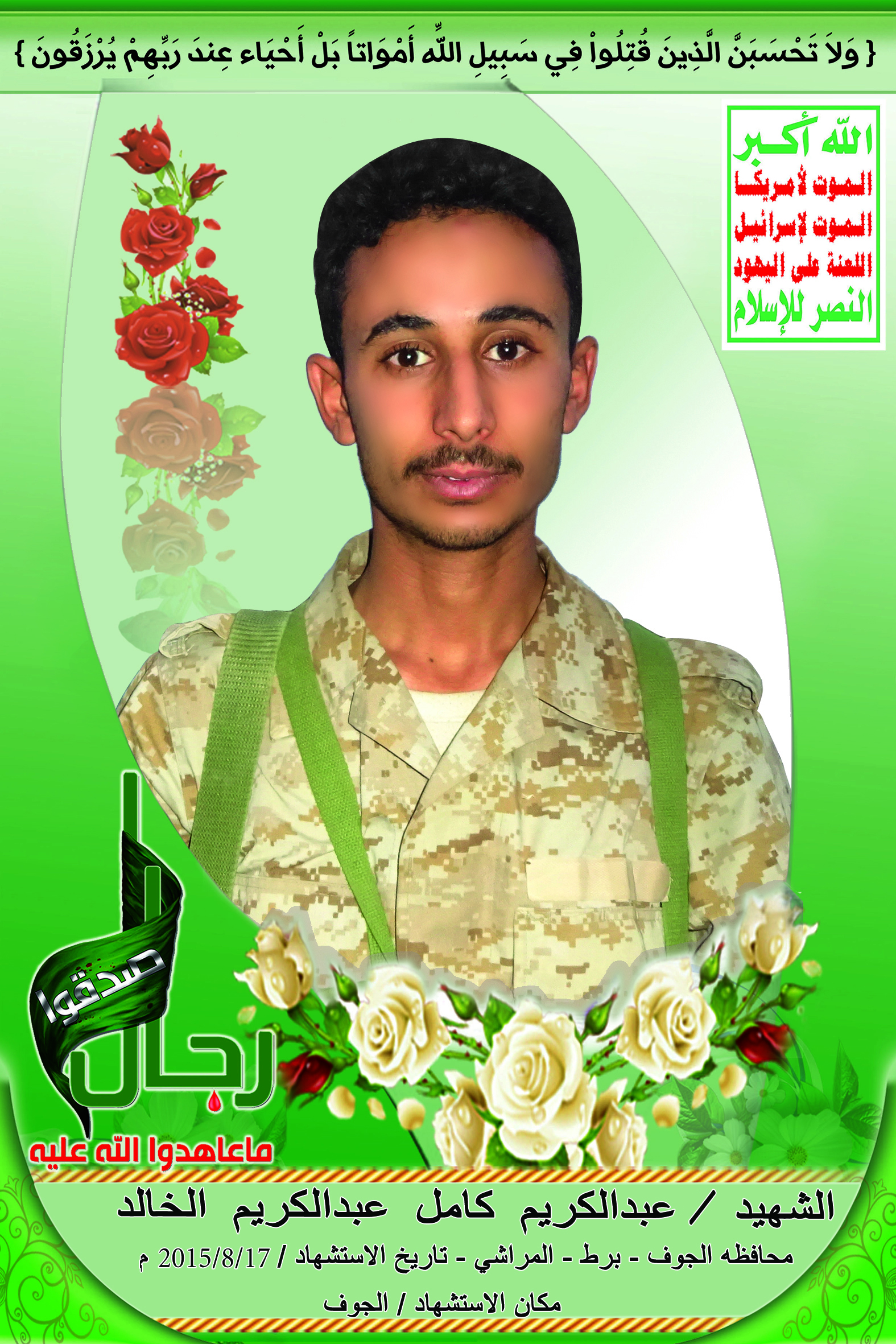 Actor عبدالكريم كامل عبدالكريم الخالد Filmography الشهيد المجاهد: عبدالكريم كامل عبدالكريم الخالد – المحافظة: الجوف المديرية: برط المراشي – معركة النفس الطويل رقم الحافظة: 123922