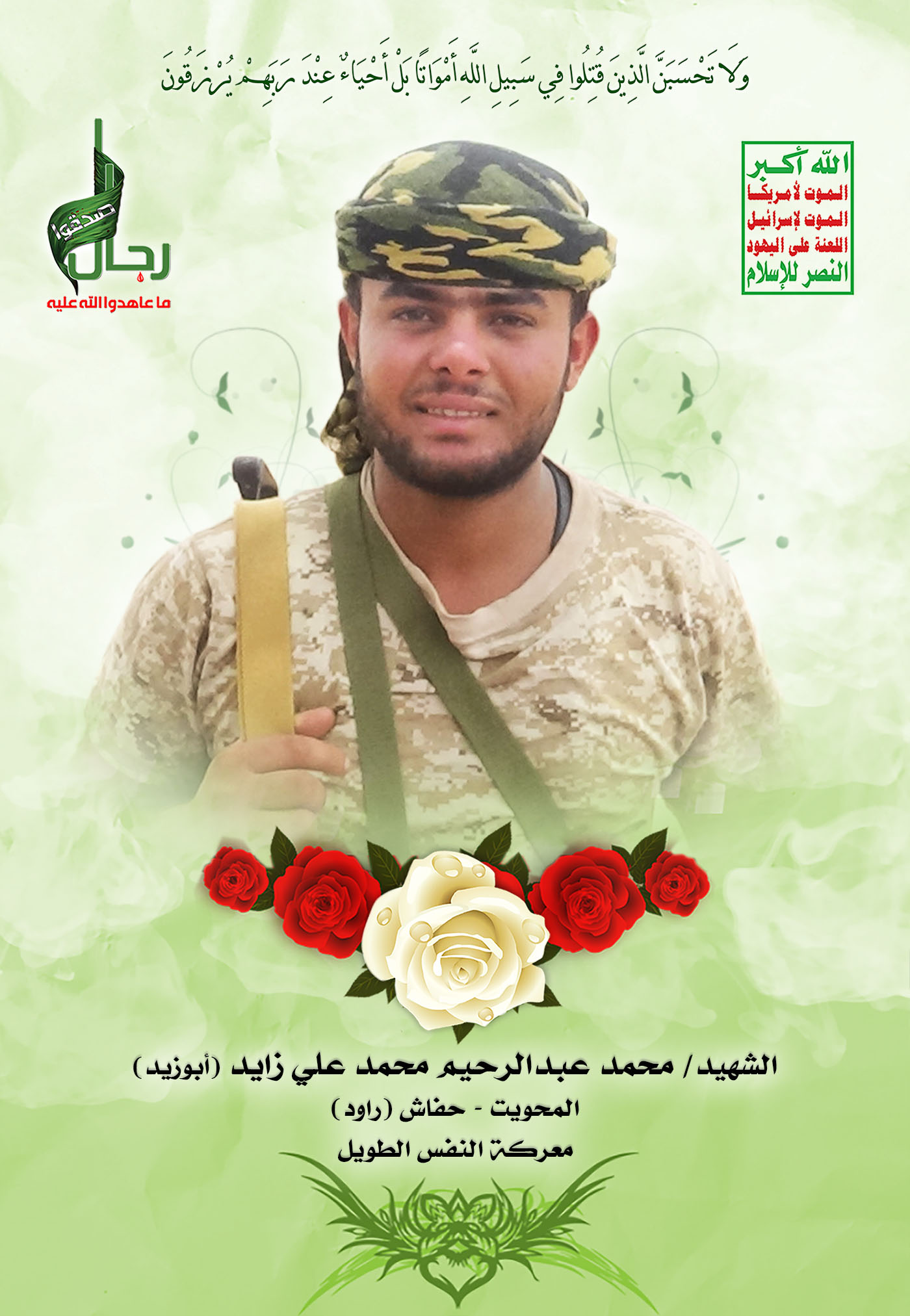 Actor محمد عبدالرحيم محمد علي زايد Filmography الشهيد المجاهد: محمد عبدالرحيم محمد علي زايد – أبو زيد المحافظة: المحويت المديرية: حفاش راود – معركة النفس الطويل رقم الحافظة: 124448 FILMOGRAPHY icon فلاشة وصايا الخالدين – محمد عبدالرحيم محمد علي زايد 12/01/2020 24/11/2021 icon فلاشة وصايا الخالدين – الشهيد محمد عبدالرحيم محمد علي زايد 12/03/2019 23/11/2021