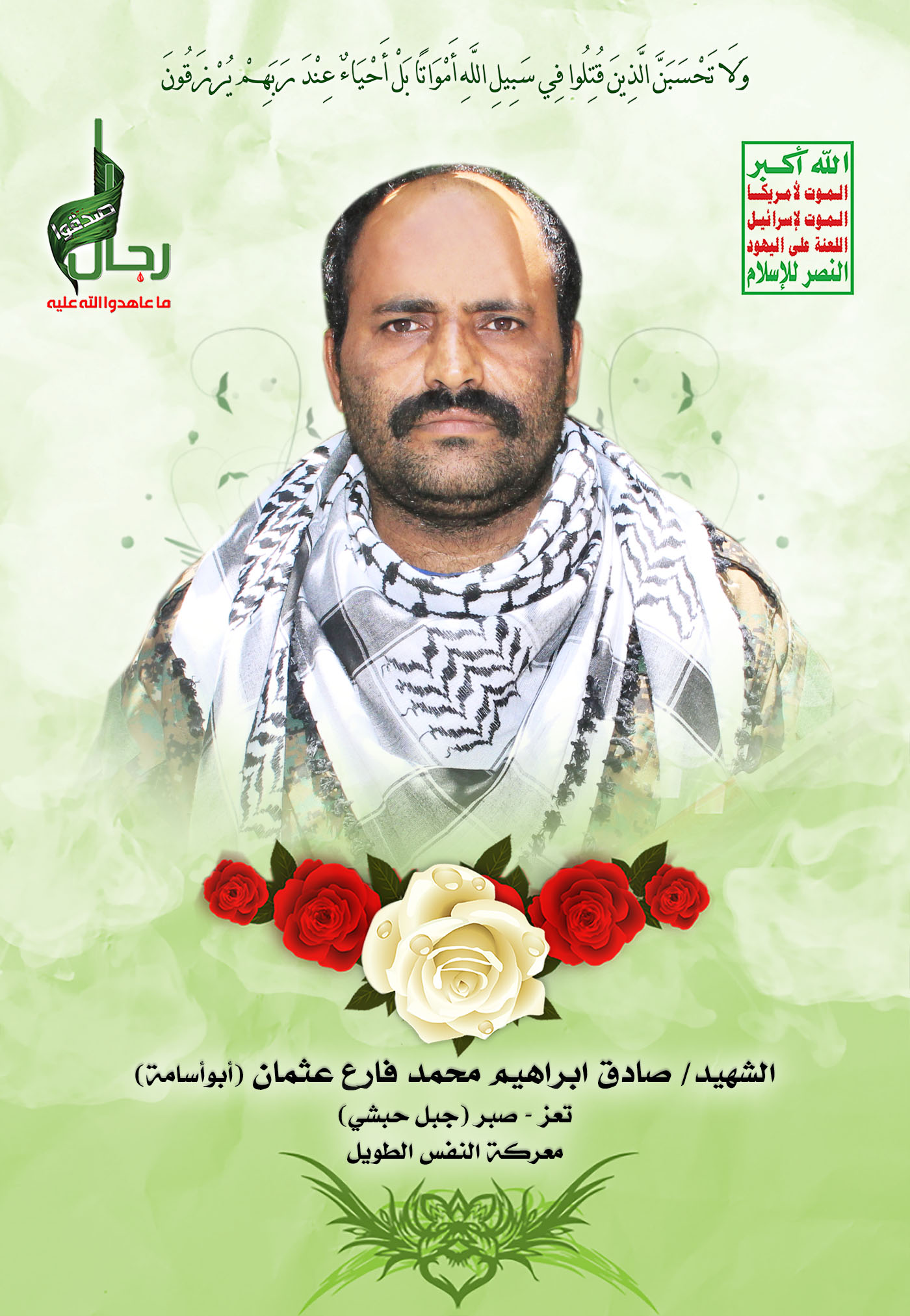 Actor صادق إبراهيم محمد فارع عثمان Filmography الشهيد المجاهد: صادق إبراهيم محمد فارع عثمان – أبو أسامة المحافظة: تعز المديرية: صبر جبل حبشي – معركة النفس الطويل رقم الحافظة: 124707
