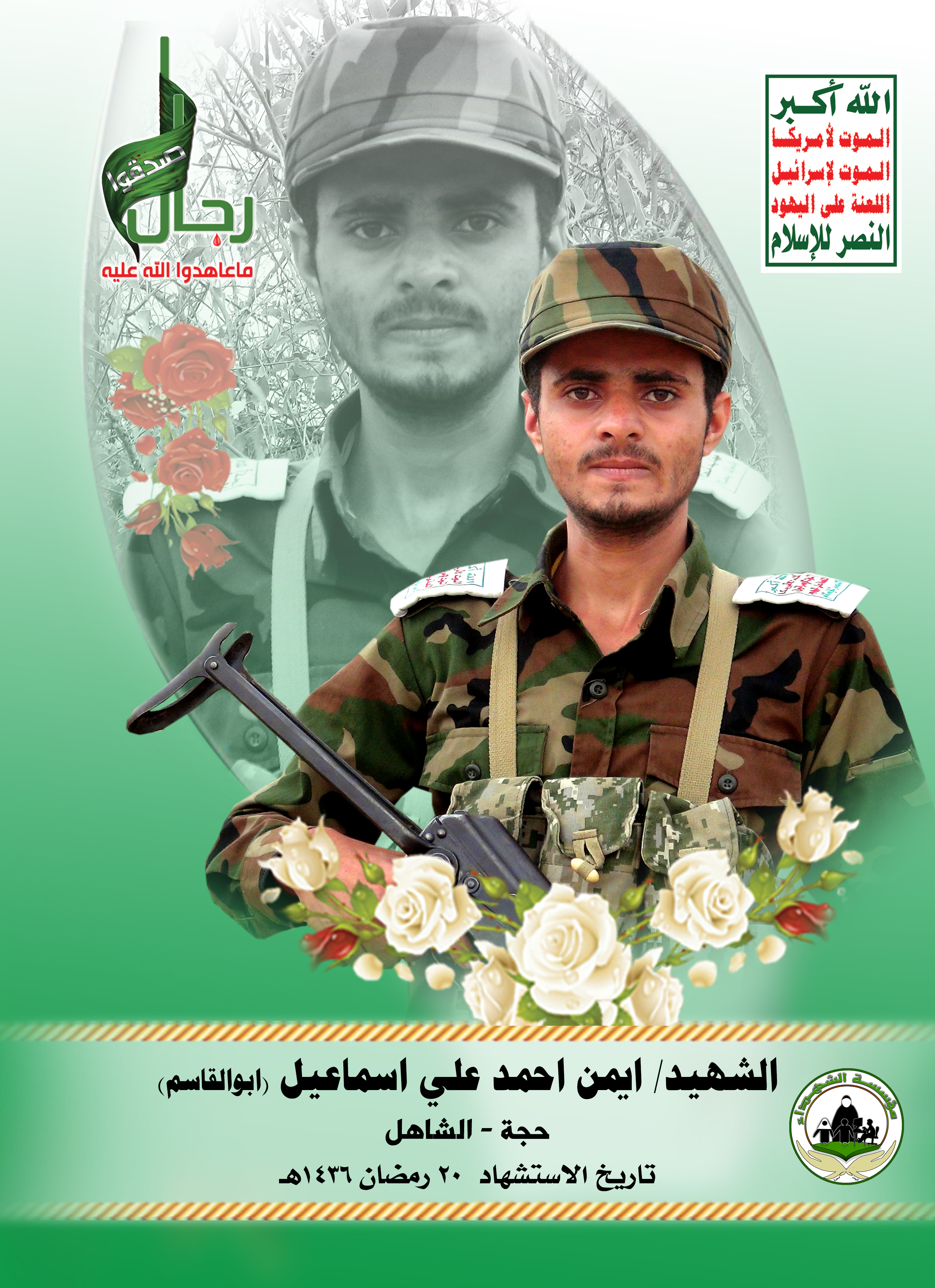 Actor أيمن أحمد علي محمد إسماعيل Filmography الشهيد المجاهد: أيمن أحمد علي محمد إسماعيل – أبو القاسم المحافظة: حجة المديرية: الشاهل المروغة – معركة النفس الطويل رقم الحافظة: 124883
