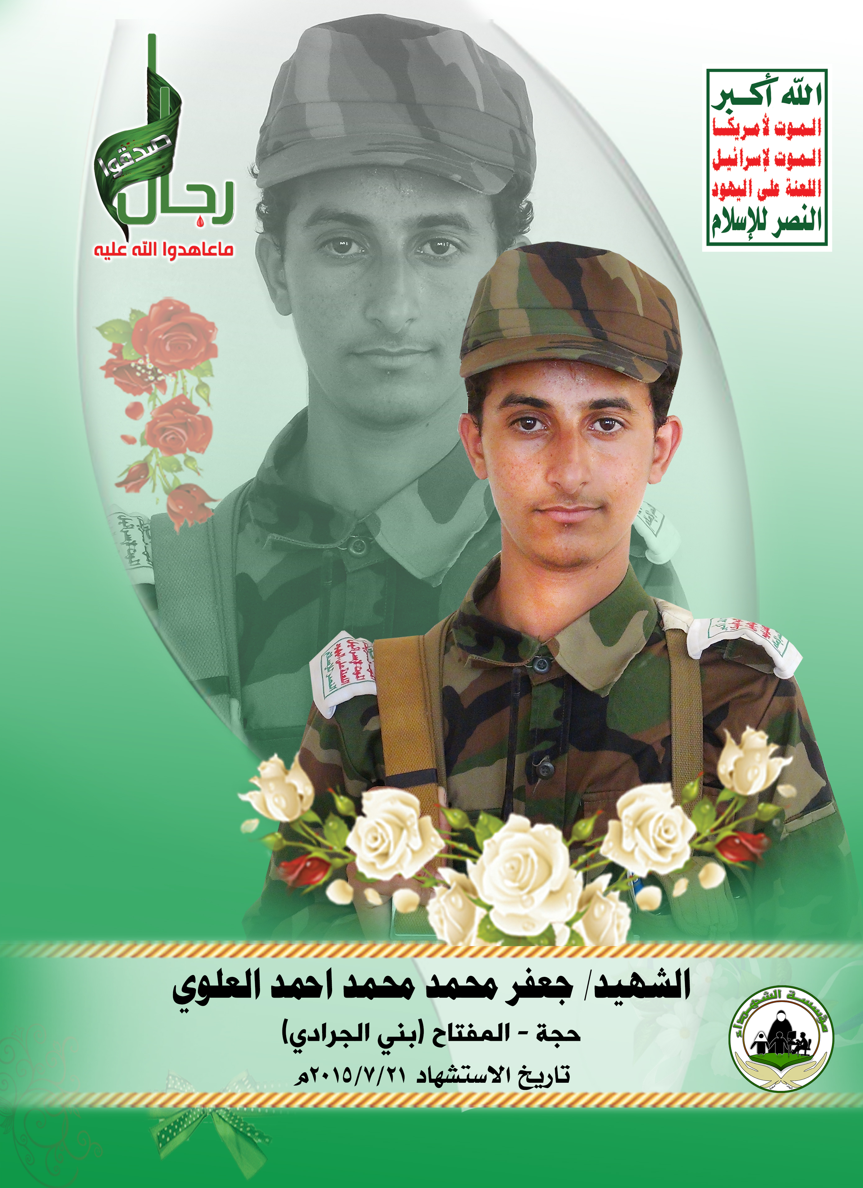 Actor جعفر محمد محمد أحمد العلوي Filmography SONY DSC SONY DSC الشهيد المجاهد: جعفر محمد محمد أحمد العلوي – أبو عبدالسلام المحافظة: حجة المديرية: المفتاح بني الجرادي – معركة النفس الطويل رقم الحافظة: 124915