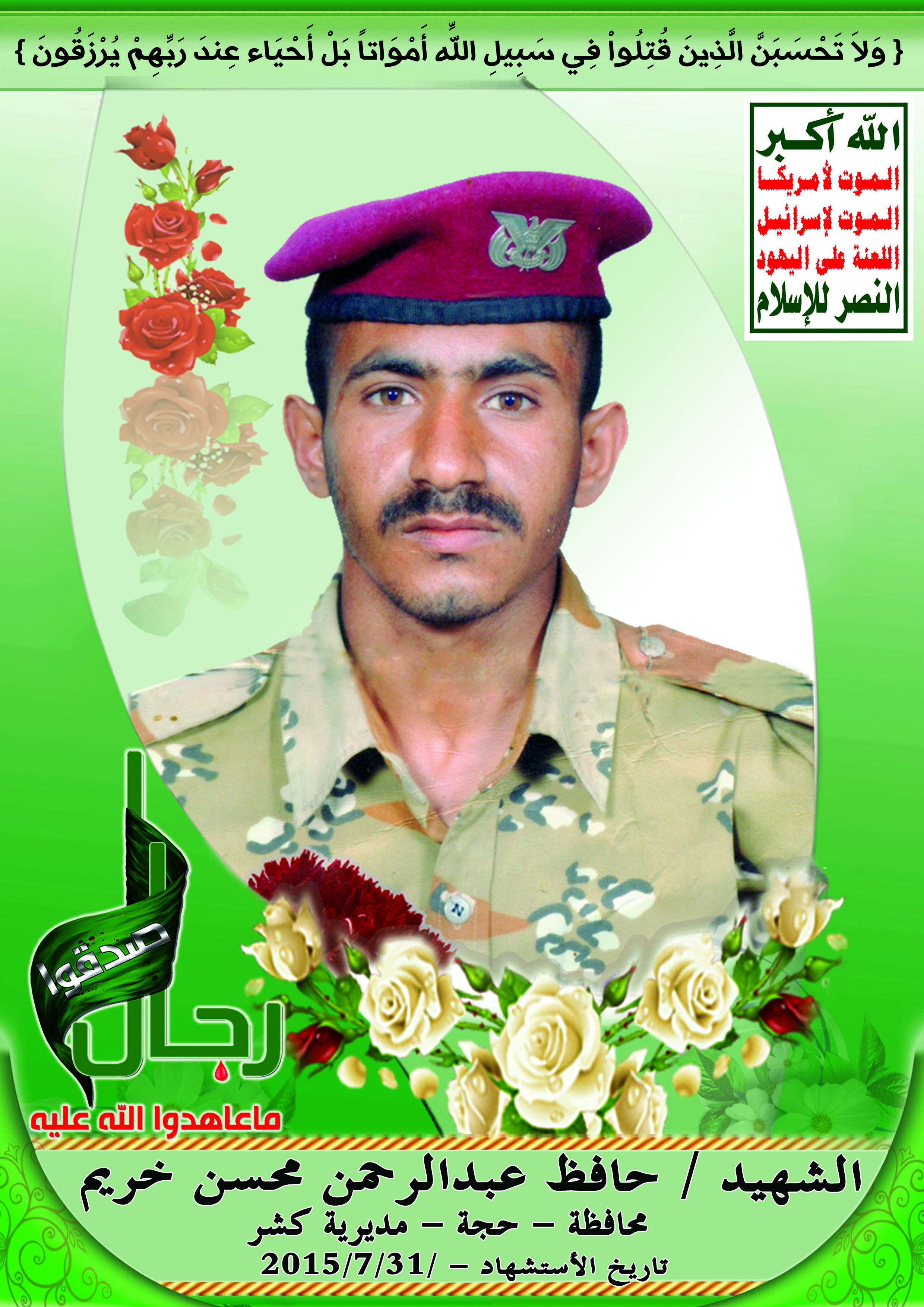 Actor حافظ عبدالرحمن محسن خريم Filmography الشهيد المجاهد: حافظ عبدالرحمن محسن خريم – المحافظة: حجة المديرية: كشر – معركة النفس الطويل رقم الحافظة: 124927