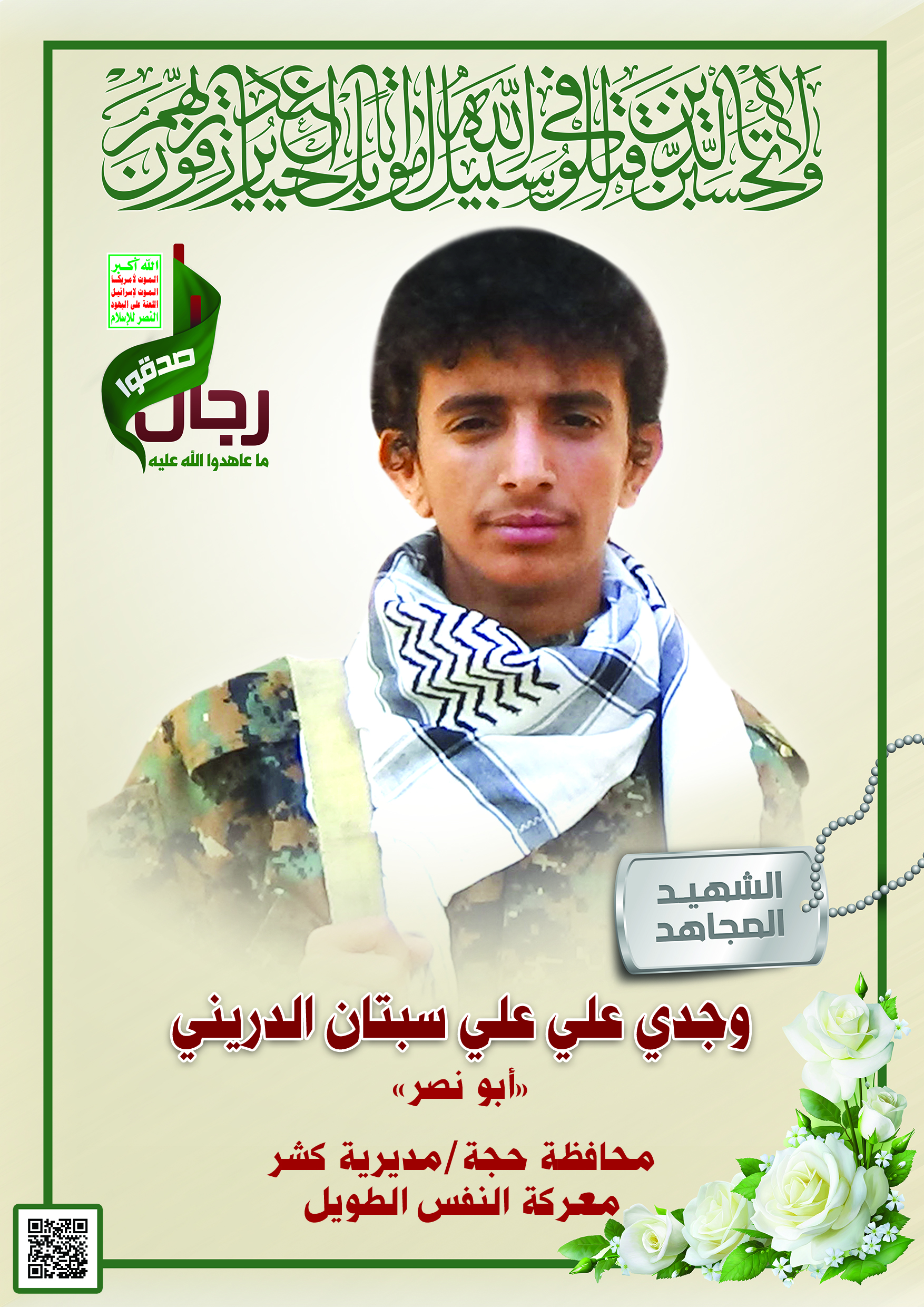 Actor وجدي علي علي سبتان سبتان الدريني Filmography الشهيد المجاهد: وجدي علي علي سبتان سبتان الدريني – أبو نصر المحافظة: حجة المديرية: كشر العبيسة – معركة النفس الطويل رقم الحافظة: 125631 FILMOGRAPHY icon الشهيد الإعلامي – وجدي علي علي سبتان الدريني (أبو نصر) 13/09/2020 24/11/2021