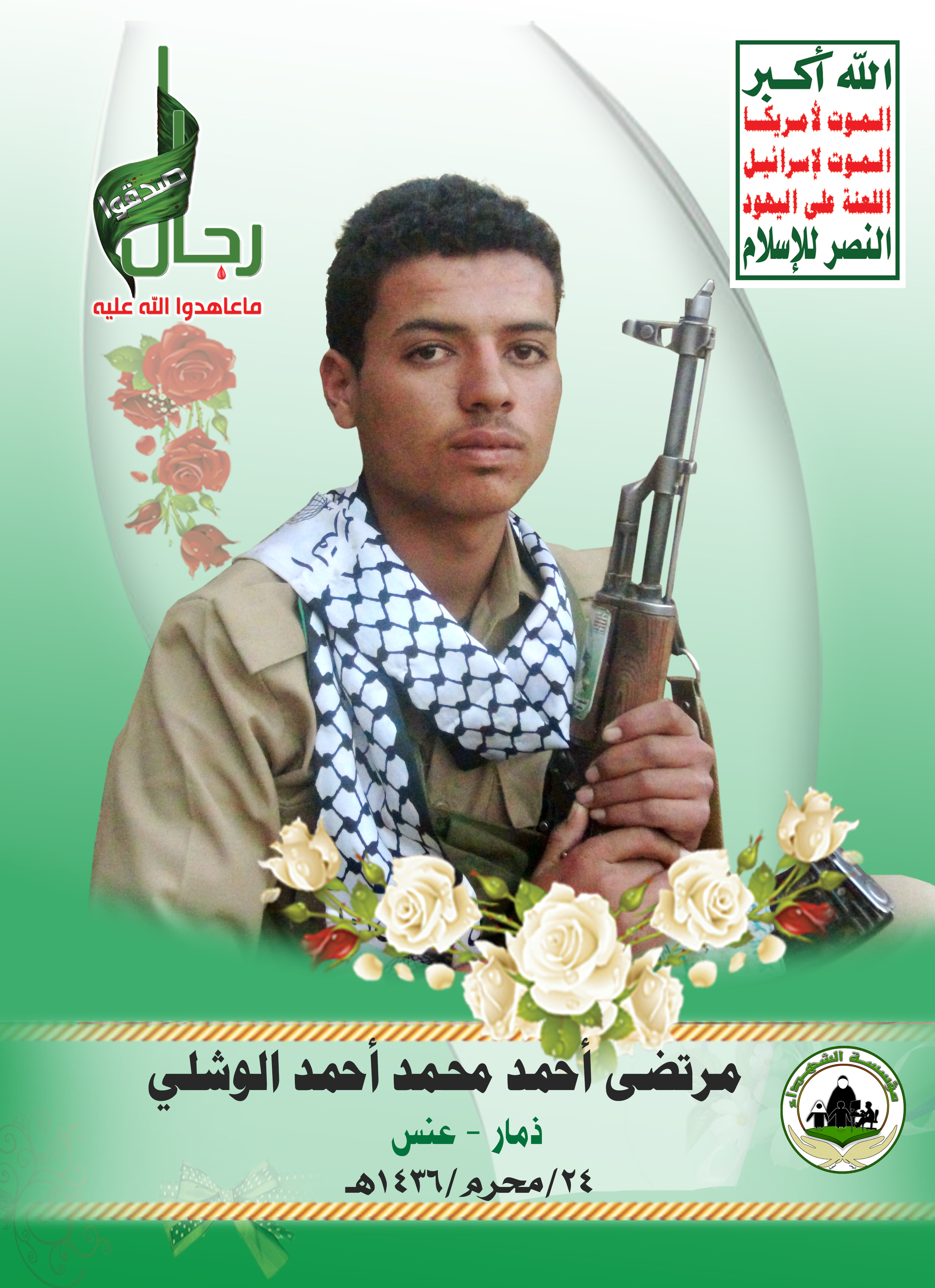 Actor مرتضى أحمد محمد أحمد الوشلي Filmography الشهيد المجاهد: مرتضى أحمد محمد أحمد الوشلي – أبو إسماعيل المحافظة: ذمار المديرية: عنس الوشل – معركة النفس الطويل رقم الحافظة: 126279 FILMOGRAPHY icon فلاشة وصايا الخالدين – مرتضى أحمد محمد أحمد الوشلي – أبو اسماعيل 12/01/2020 24/11/2021