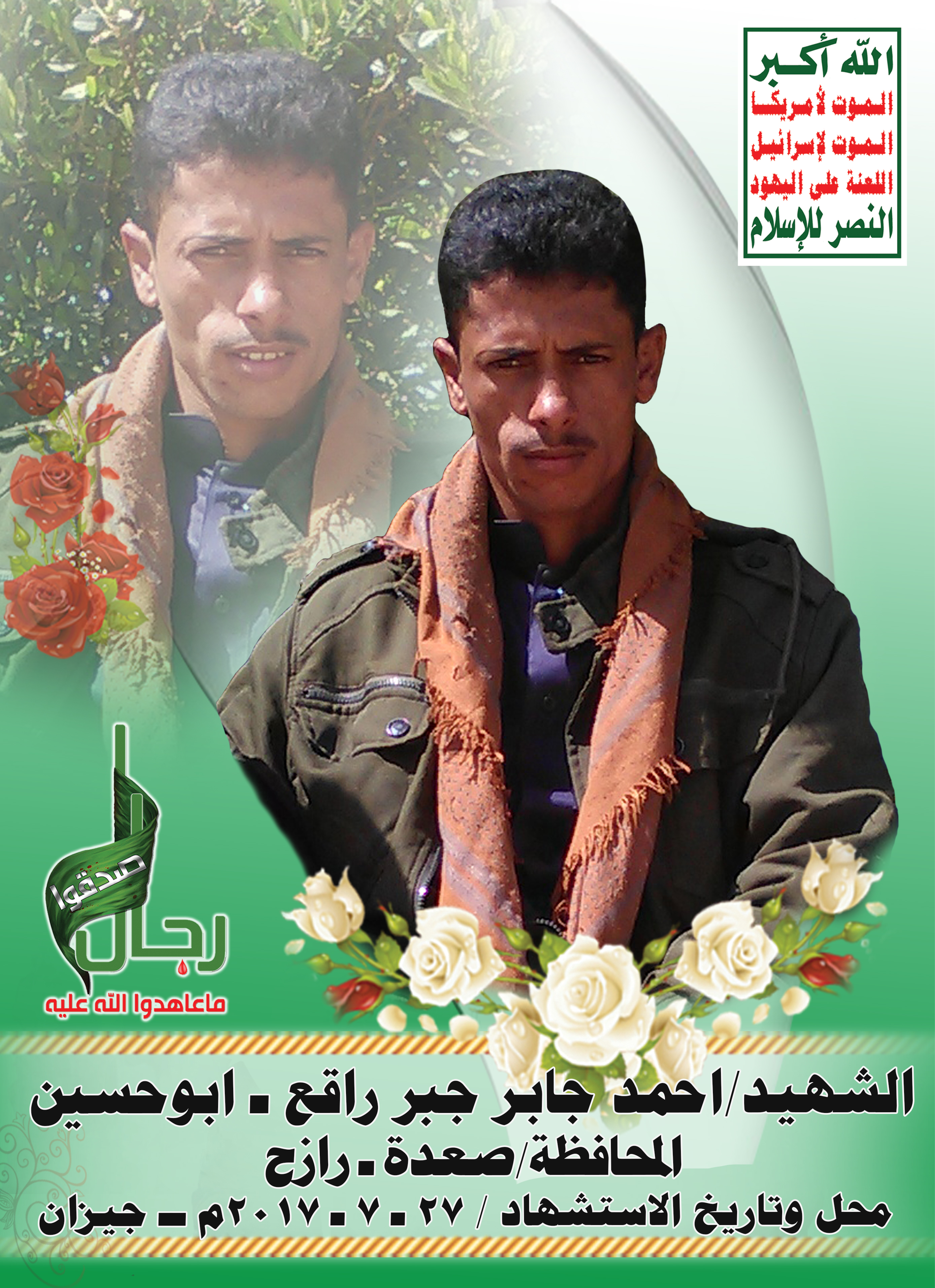 Actor أحمد جابر جبر راقع الرازحي Filmography الشهيد المجاهد: أحمد جابر جبر راقع الرازحي – أبو حسين المحافظة: صعدة المديرية: رازح – معركة النفس الطويل رقم الحافظة: 126478