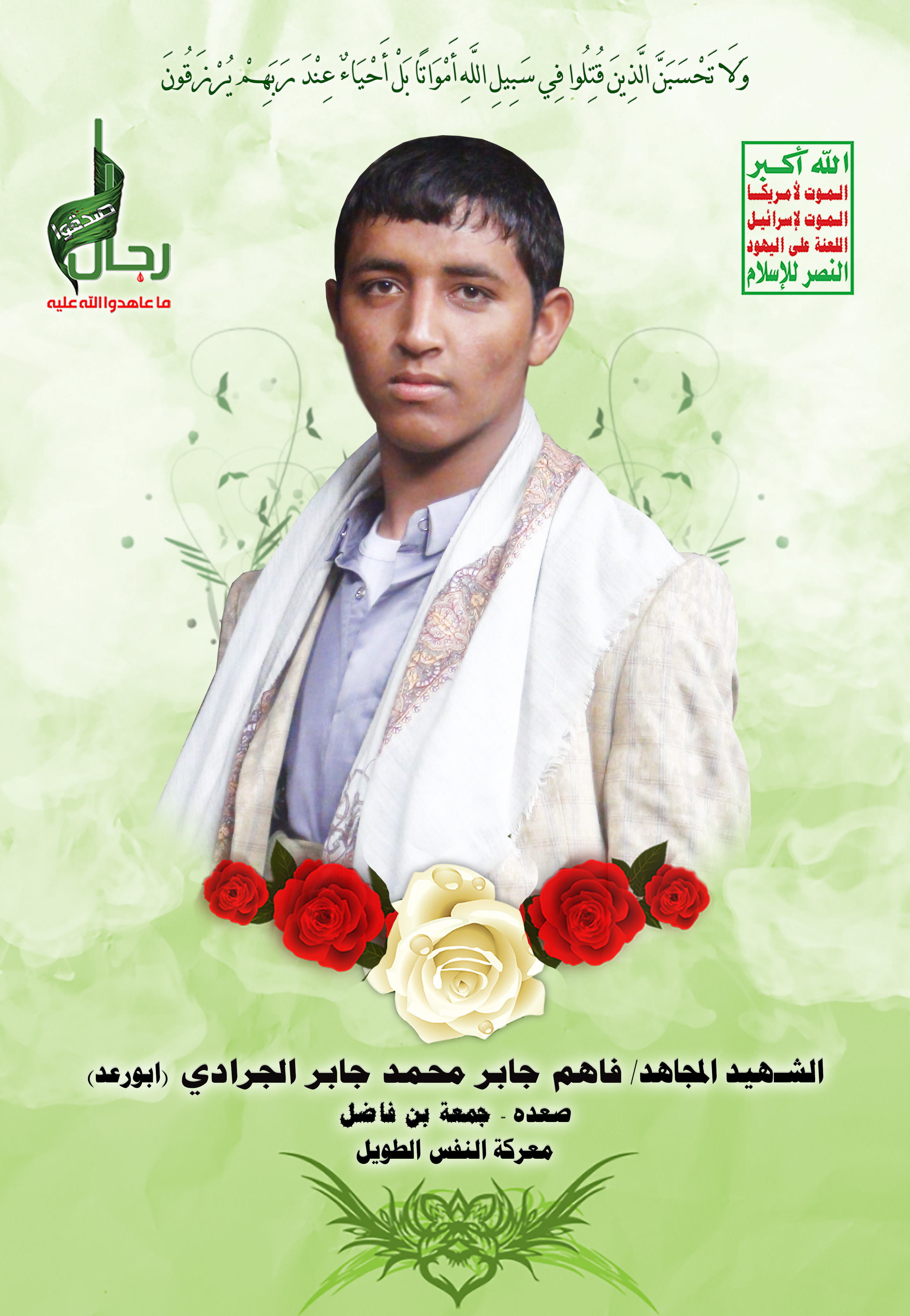 Actor فاهم جابر محمد جابر الجرادي Filmography الشهيد المجاهد: فاهم جابر محمد جابر الجرادي – أبو رعد المحافظة: صعدة المديرية: حيدان خولان – معركة النفس الطويل رقم الحافظة: 127587 FILMOGRAPHY icon فلاشة وصايا الخالدين – فاهم جابر محمد جابر الجرادي – أبو رعد 10/01/2020 25/11/2021