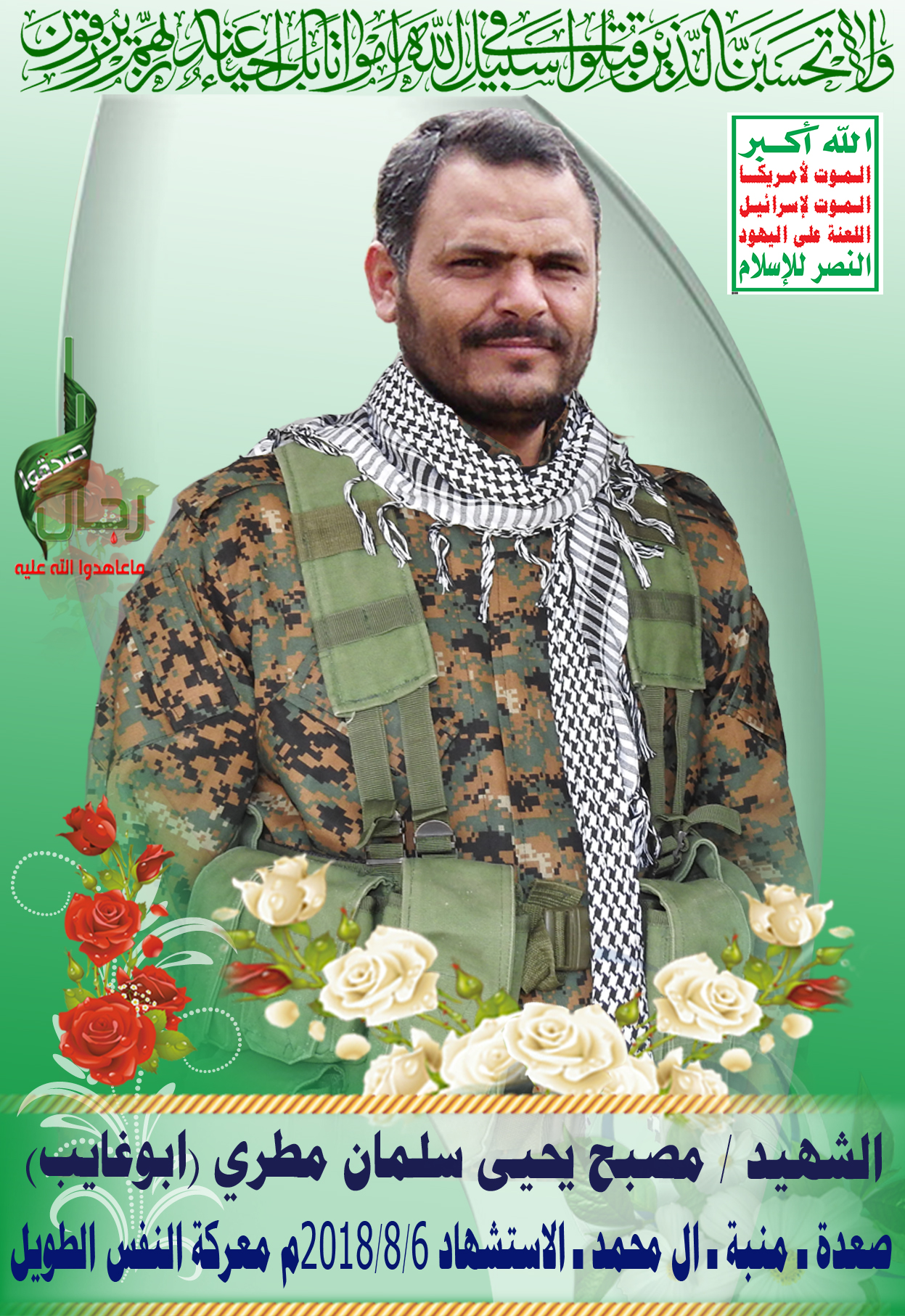 Actor مصبح يحيى سلمان مطري Filmography الشهيد المجاهد: مصبح يحيى سلمان مطري – أبو غايب المحافظة: صعدة المديرية: منبة ال محمد – معركة النفس الطويل رقم الحافظة: 127879 FILMOGRAPHY icon فلاشة لكم الخلود – الشهيد مصبح يحيى سلمان مطري – أبو غايب 07/01/2020 25/11/2021
