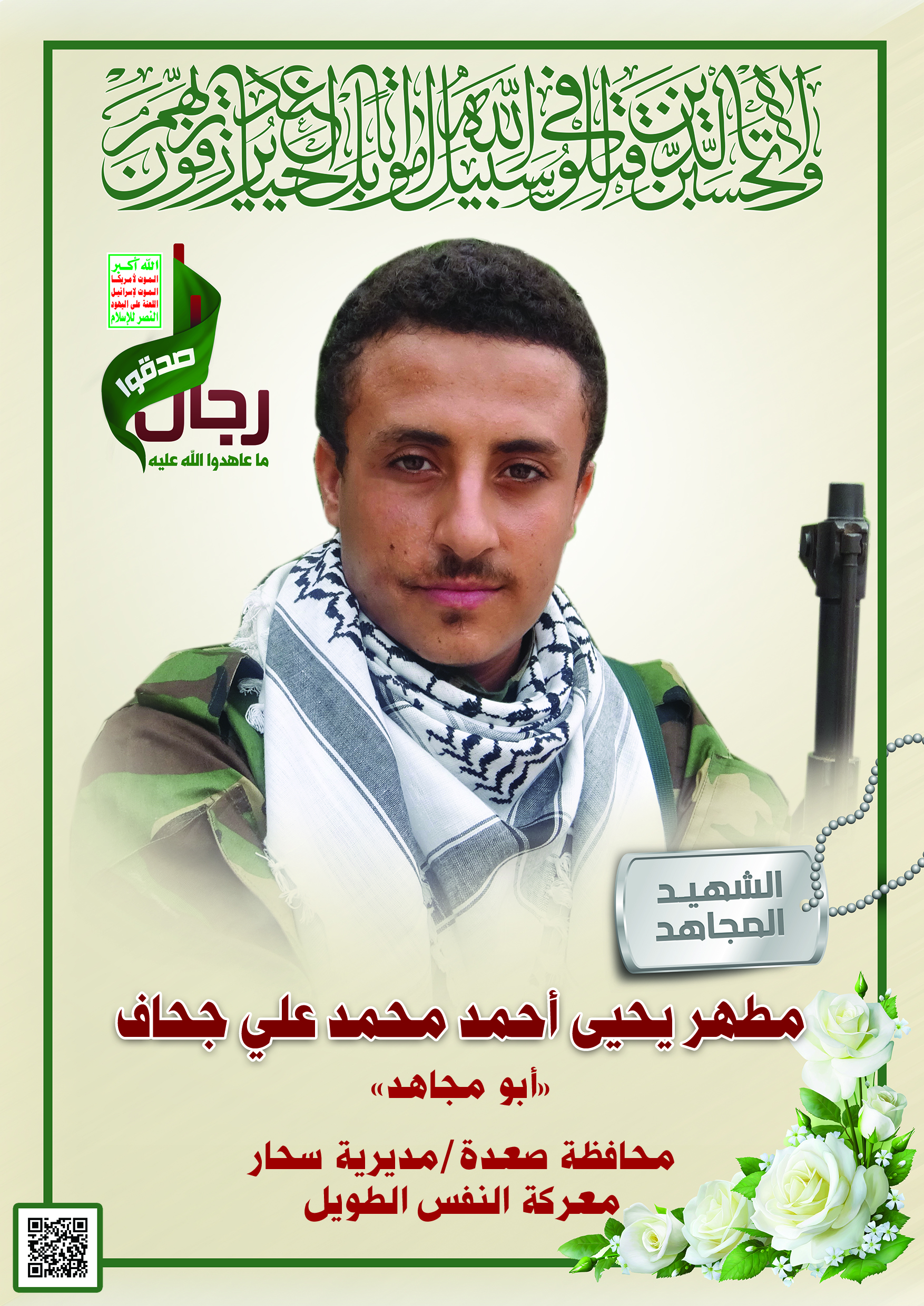 Actor مطهر يحيى أحمد محمد علي عبدالرحمن جحاف Filmography الشهيد المجاهد: مطهر يحيى أحمد محمد علي عبدالرحمن جحاف – أبو مجاهد المحافظة: صعدة المديرية: سحار – معركة النفس الطويل رقم الحافظة: 127897 FILMOGRAPHY icon الشهيد المجاهد – مطهر يحيى احمد محمد علي عبدالرحمن جحاف – أبو مجاهد 28/01/2019 27/11/2021