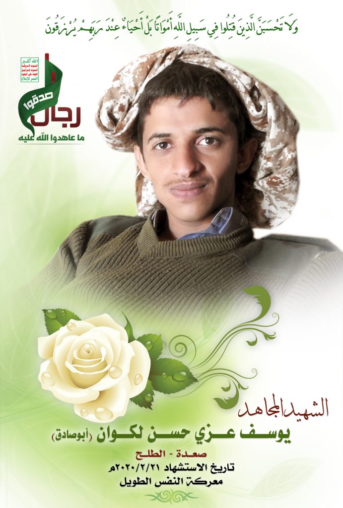 Actor يوسف عزي حسن لكوان Filmography الشهيد المجاهد: يوسف عزي حسن لكوان – أبو رعد المحافظة: صعدة المديرية: ساقين بني واس – معركة النفس الطويل رقم الحافظة: 128095 FILMOGRAPHY icon مدرسة الإيمان – القول السديد – 1442هـ 30/12/2020 23/12/2021 icon مونتاج زامل درب الشهادة | أداء/ لطف القحوم & عيسى الليث – 1441هـ 29/12/2020 18/12/2021 icon الشهيد الإعلامي – يوسف عزي حسن لكوان (أبو صادق) 26/02/2020 25/11/2021 icon لكم الخلود – الشهيد المجاهد يوسف عزي حسن لكوان (أبو صادق) 26/02/2020 25/11/2021