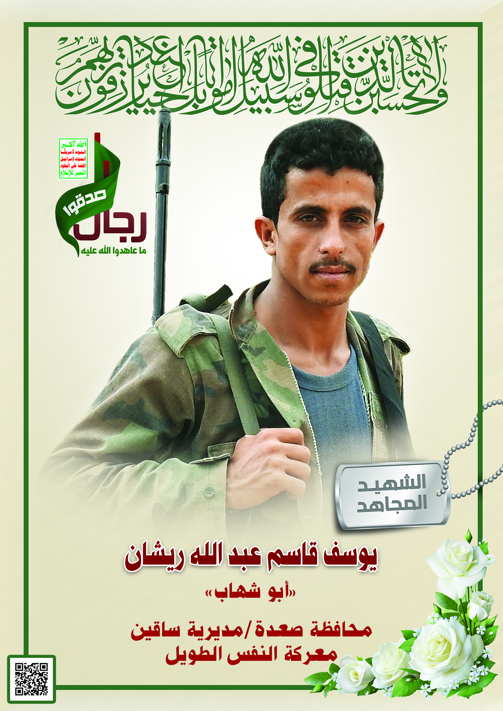 Actor يوسف قاسم عبدالله مهدي عيضة ريشان Filmography الشهيد المجاهد: يوسف قاسم عبدالله مهدي عيضة ريشان – أبو شهاب المحافظة: صعدة المديرية: ساقين – بني واس معركة النفس الطويل رقم الحافظة: 128104 FILMOGRAPHY icon وصايا الخالدين || الشهيد/يوسف قاسم عبدالله ريشان (أبو شهاب) 07/02/2023