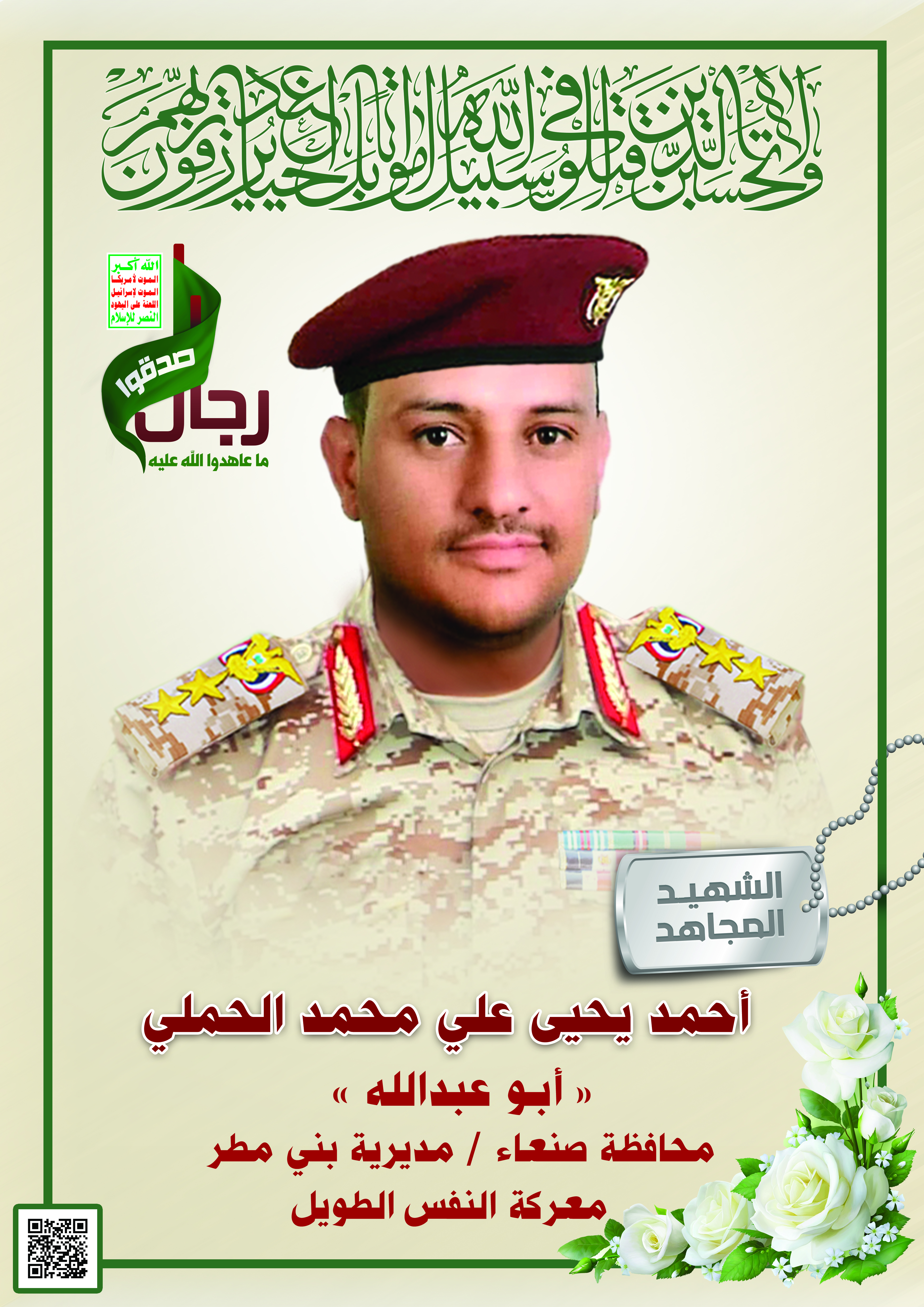Actor أحمد يحيى علي محمد الحملي Filmography الشهيد المجاهد: أحمد يحيى علي محمد الحملي – أبو عبدالله المحافظة: صنعاء المديرية: بني مطر حمل – معركة النفس الطويل رقم الحافظة: 128252 FILMOGRAPHY icon لكم الخلود – الشهيد المجاهد أحمد يحيى علي محمد الحملي (أبو عبدالله) 19/07/2020 23/11/2021 icon مونتاج نشيد خجلاً | فرقة أنصار الله – 1441هـ 11/01/2020 18/12/2021