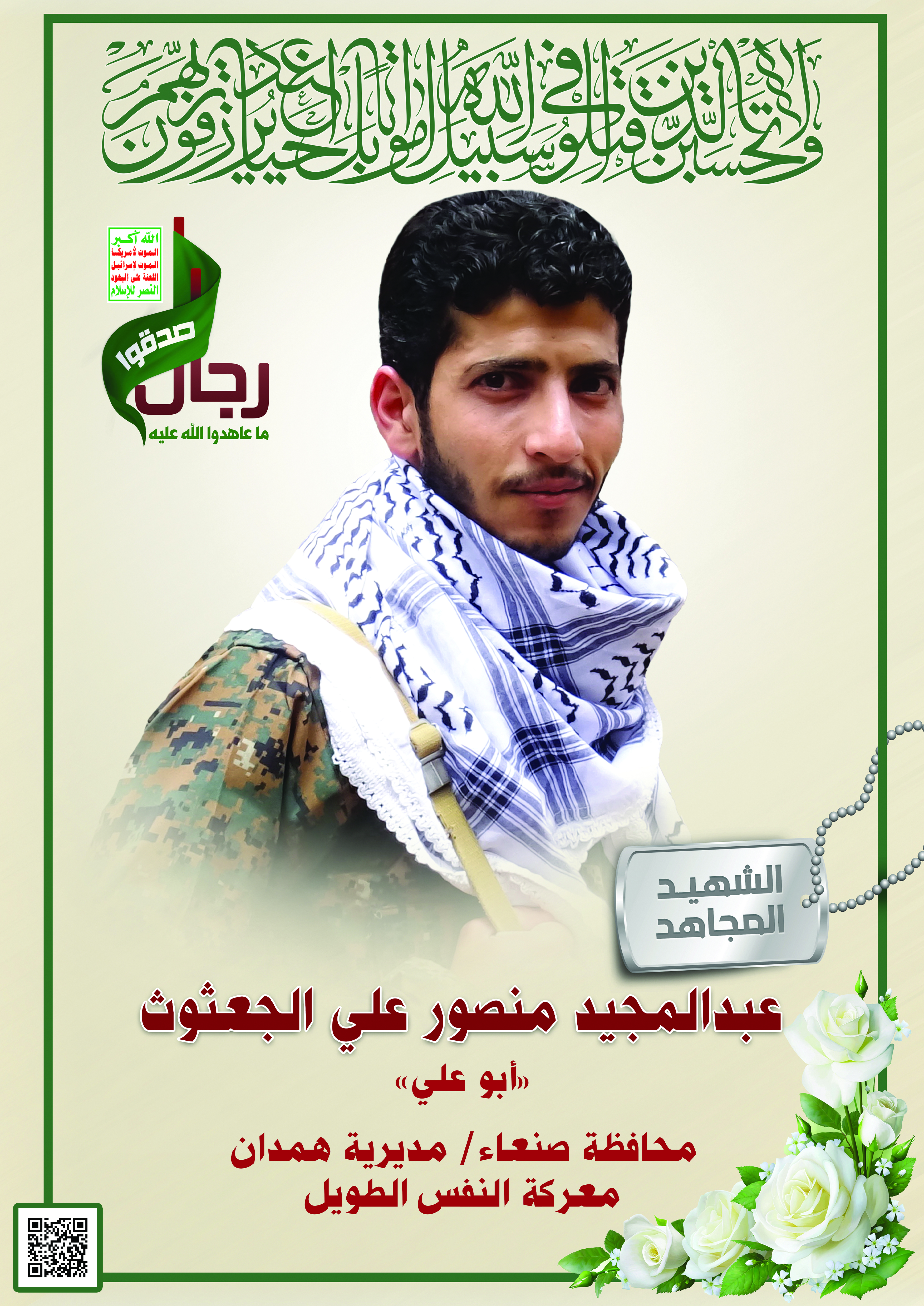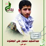 Actor عبدالمجيد منصور علي حزام الجعثوث Filmography الشهيد المجاهد: عبدالمجيد منصور علي حزام الجعثوث – أبو علي المحافظة: صنعاء المديرية: همدان ضلاع – معركة النفس الطويل رقم الحافظة: 128722 FILMOGRAPHY icon فلاشة لكم الخلود – الشهيد عبد المجيد منصور الجعثوث ( أبو علي) 09/10/2019 27/11/2021
