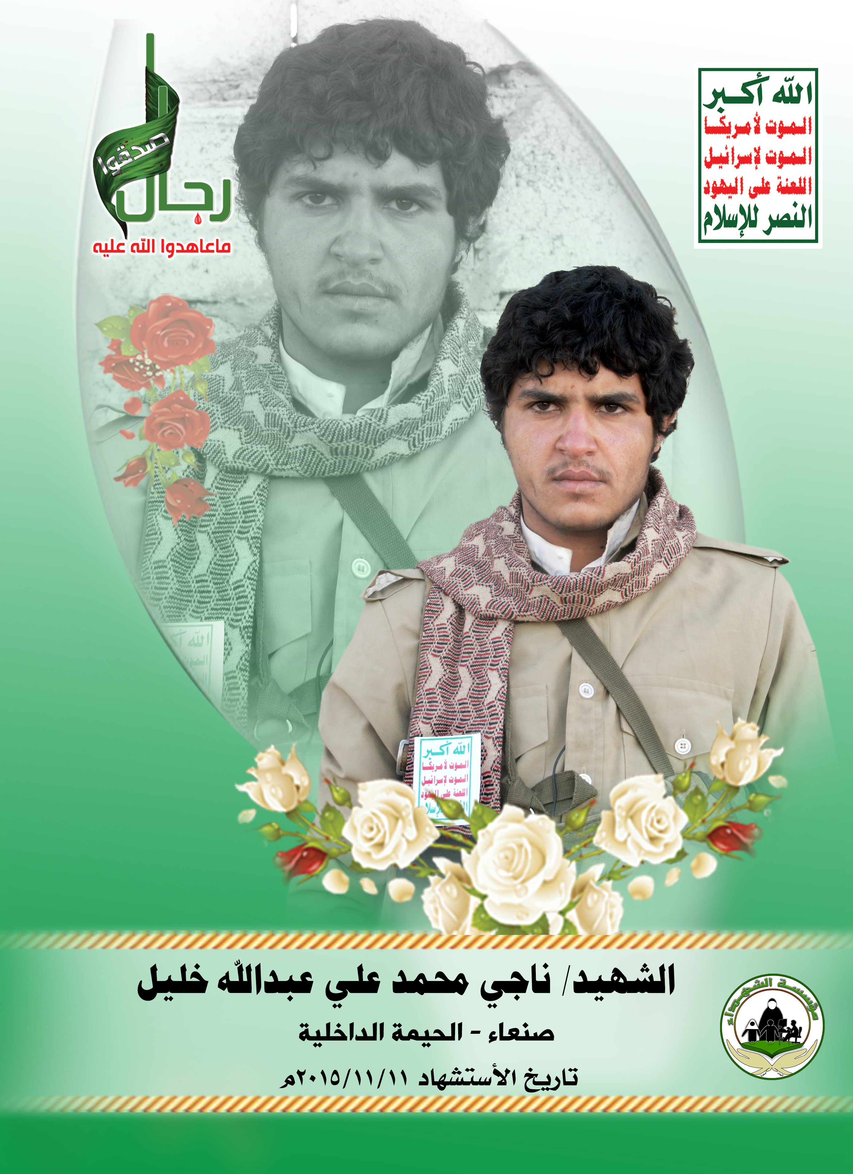 Actor ناجي محمد أحمد علي خليل Filmography SONY DSC SONY DSC الشهيد المجاهد: ناجي محمد أحمد علي خليل – أبو علي المحافظة: صنعاء المديرية: الحيمة الداخلية – بلاد القبايل معركة النفس الطويل رقم الحافظة: 129148