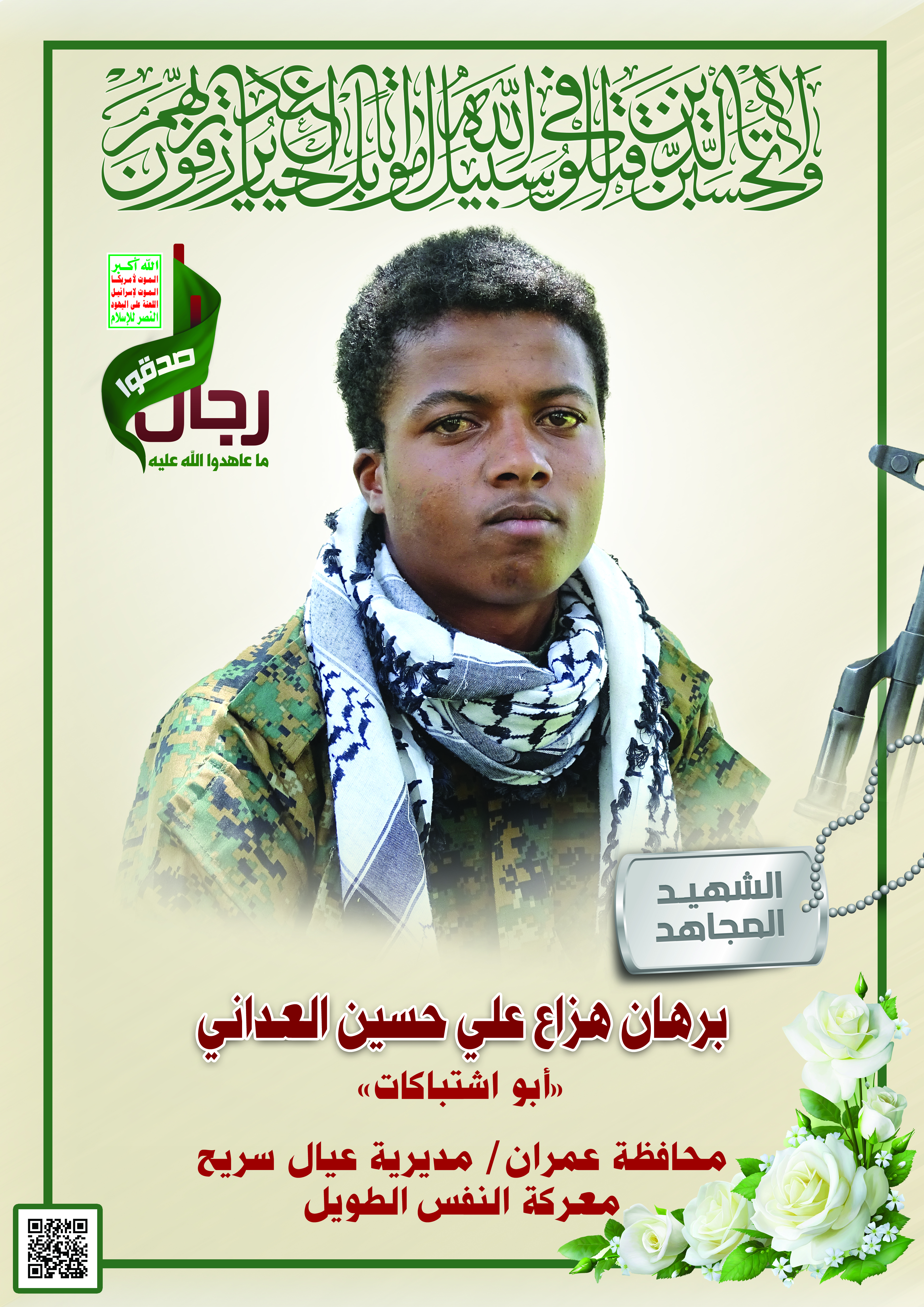 Actor برهان هزاع علي حسين حيدر العداني Filmography الشهيد المجاهد: برهان هزاع علي حسين حيدر العداني – أبو اشتباكات المحافظة: عمران المديرية: عيال سريح – معركة النفس الطويل رقم الحافظة: 129416 FILMOGRAPHY icon وصايا الخالدين – الشهيد برهان هزاع علي حسين حيدر العداني – ابو اشتباكات 12/11/2024 12/11/2024