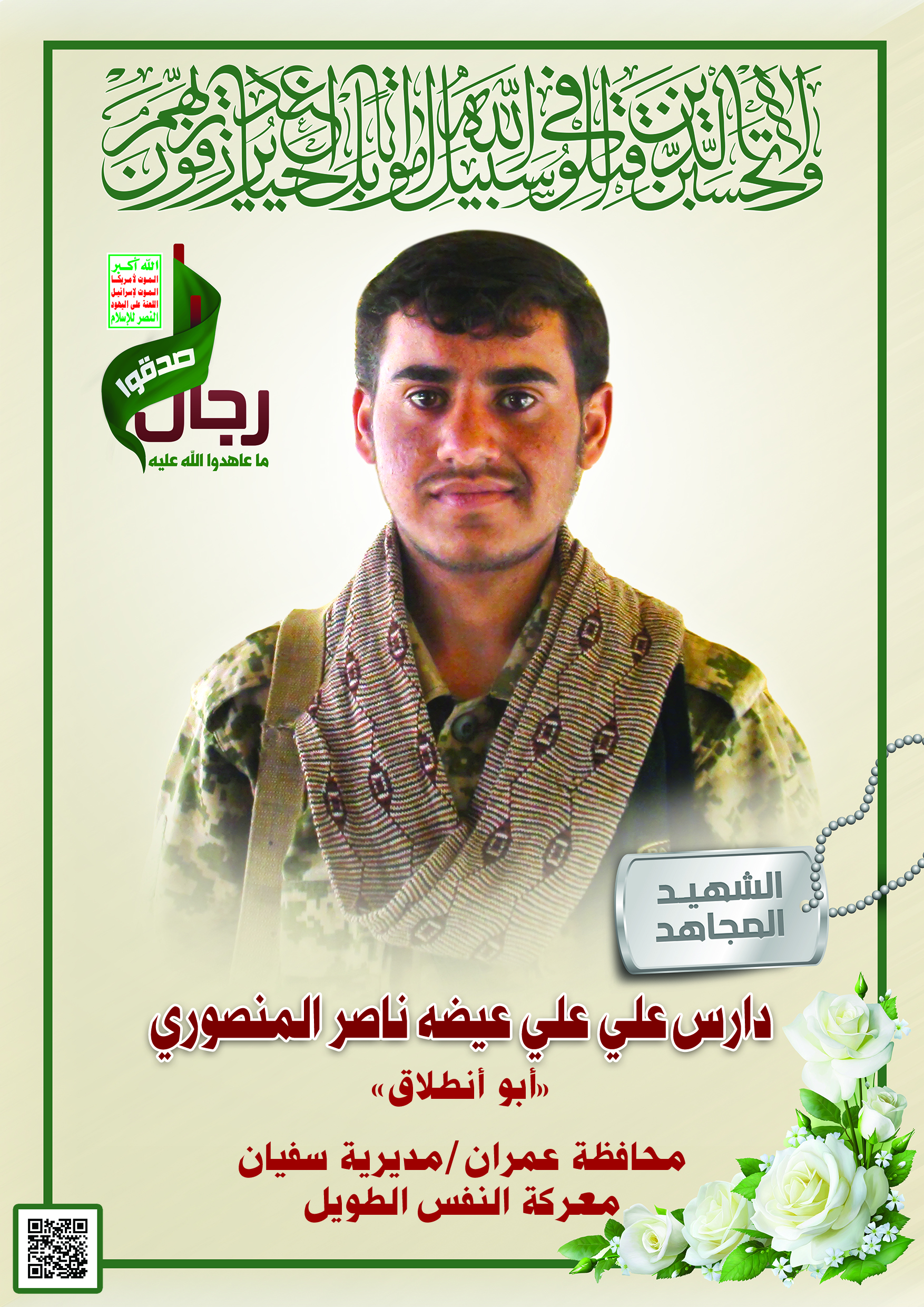 Actor دارس علي علي عيضة ناصر المنصوري Filmography الشهيد المجاهد: دارس علي علي عيضة ناصر المنصوري – أبو انطلاق المحافظة: عمران المديرية: سفيان – المناصير معركة النفس الطويل رقم الحافظة: 129513