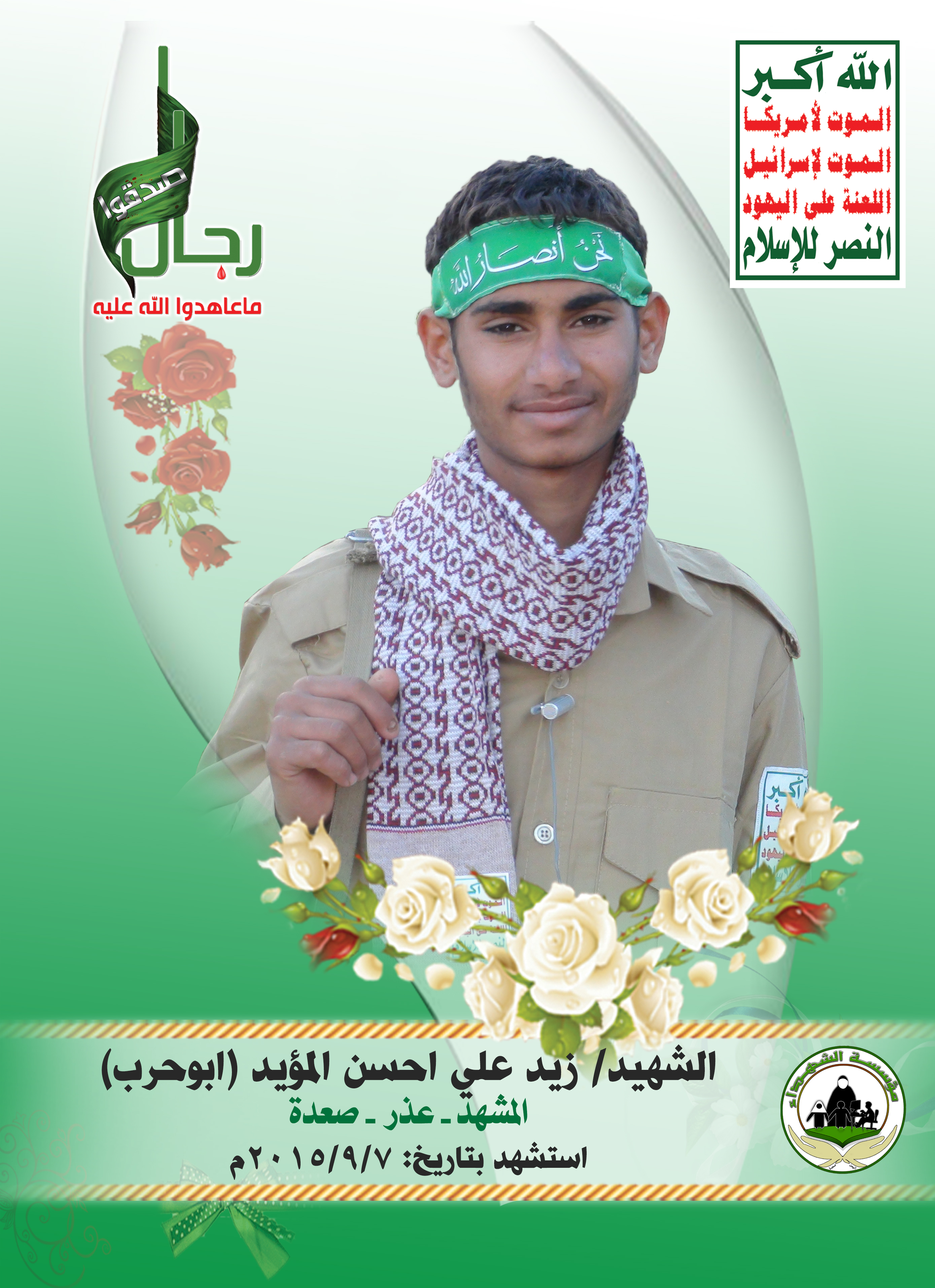 Actor زيد علي أحسن خميره المؤيدي Filmography الشهيد المجاهد: زيد علي أحسن خميره المؤيدي – أبو حرب المحافظة: عمران المديرية: عذر – المشهد معركة النفس الطويل رقم الحافظة: 129544