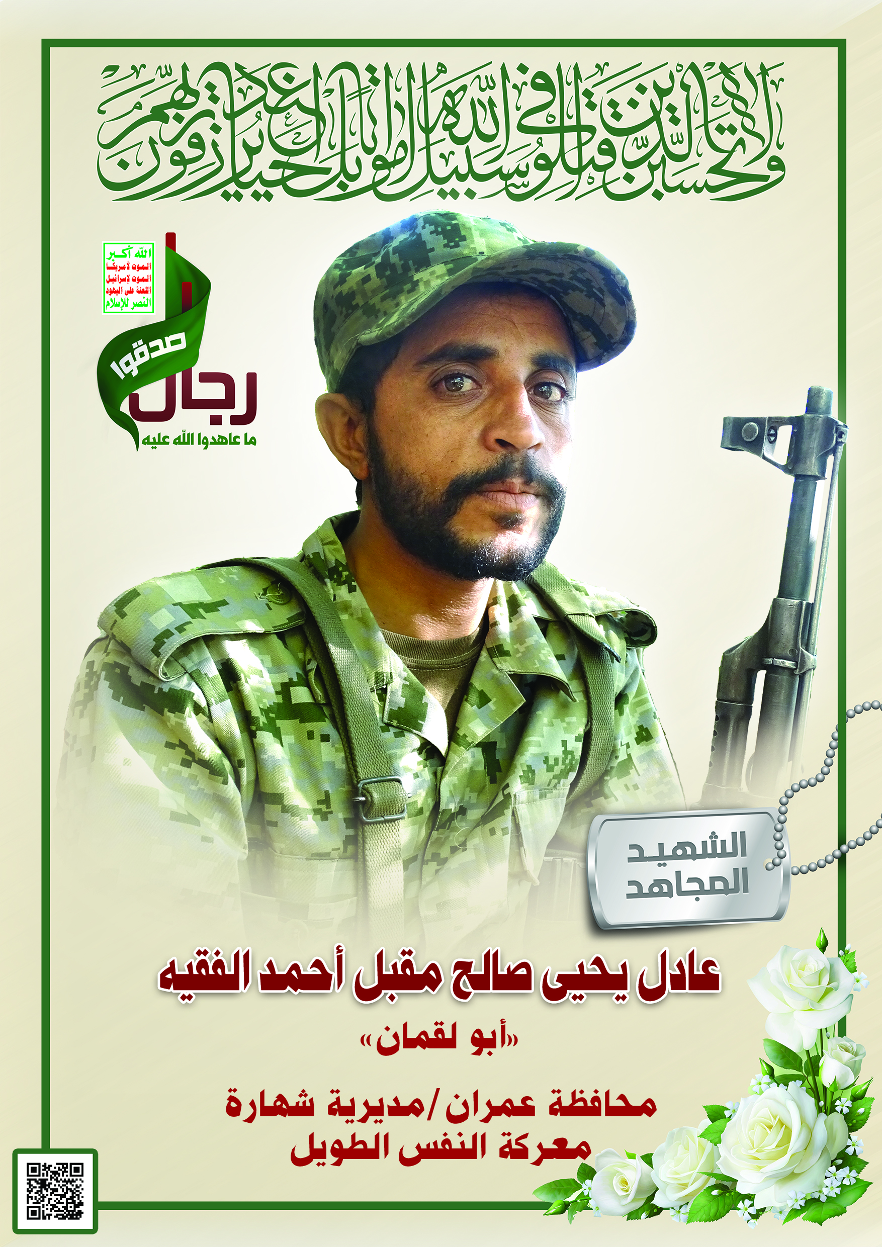 Actor عادل يحيى صالح مقبل أحمد الفقيه Filmography SONY DSC SONY DSC الشهيد المجاهد: عادل يحيى صالح مقبل أحمد الفقيه – أبو لقمان المحافظة: عمران المديرية: شهارة – ذري معركة النفس الطويل رقم الحافظة: 129662 FILMOGRAPHY icon وصايا الخالدين || الشهيد/ عادل يحيى صالح مقبل أحمد الفقيه (أبو لقمان) 13/01/2020 06/12/2021