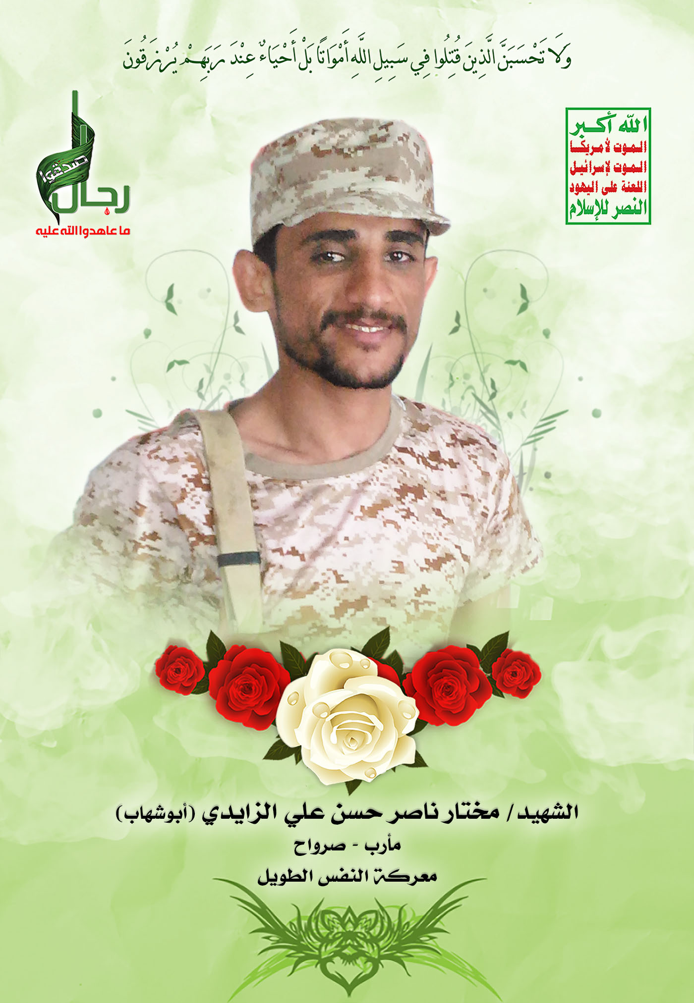 Actor مختار ناصر حسن علي الزايدي Filmography الشهيد المجاهد: مختار ناصر حسن علي الزايدي – أبو شهاب المحافظة: مأرب المديرية: صرواح – معركة النفس الطويل رقم الحافظة: 130240