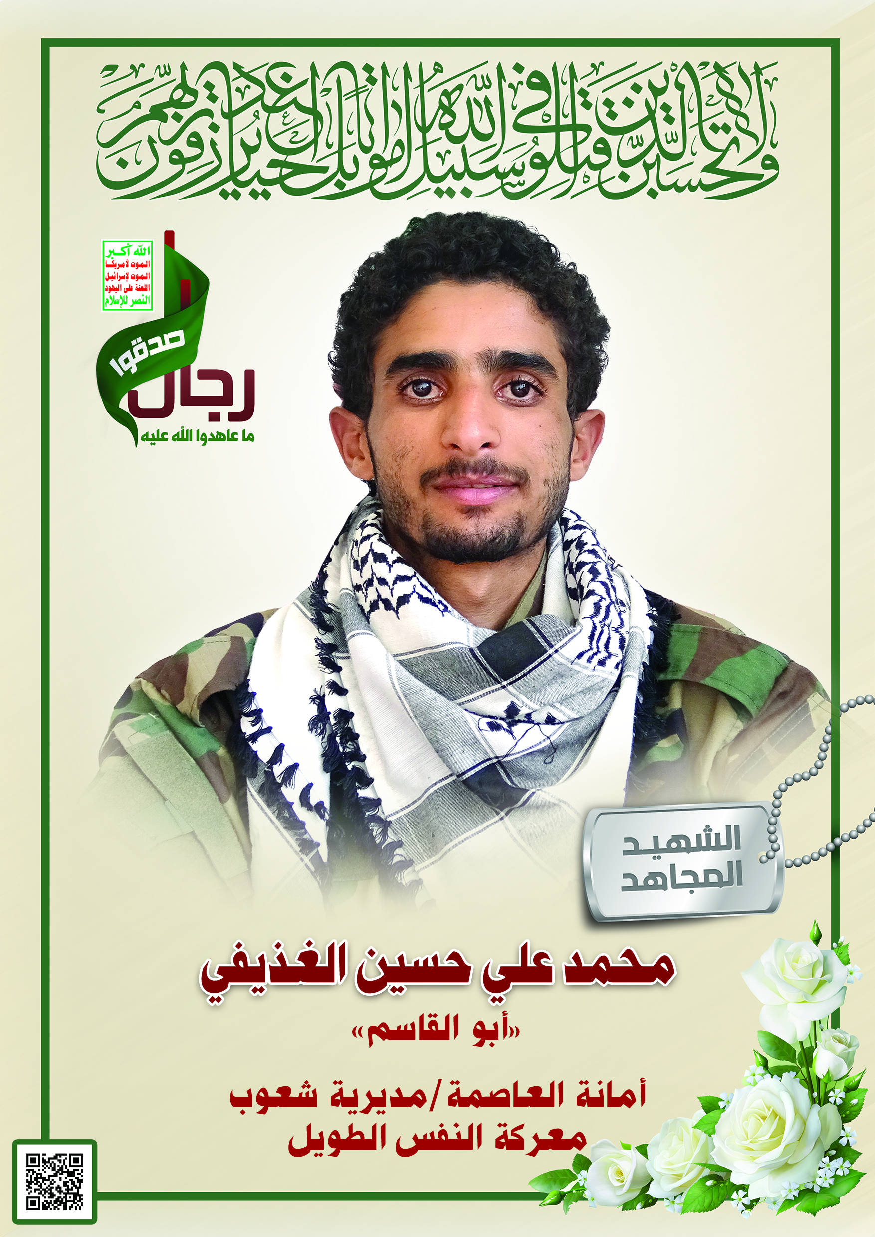 Actor محمد علي حسين أحمد الغذيفي Filmography الشهيد المجاهد: محمد علي حسين أحمد الغذيفي – أبو القاسم المحافظة: الأمانة المديرية: شعوب – الحافة معركة النفس الطويل رقم الحافظة: 130343