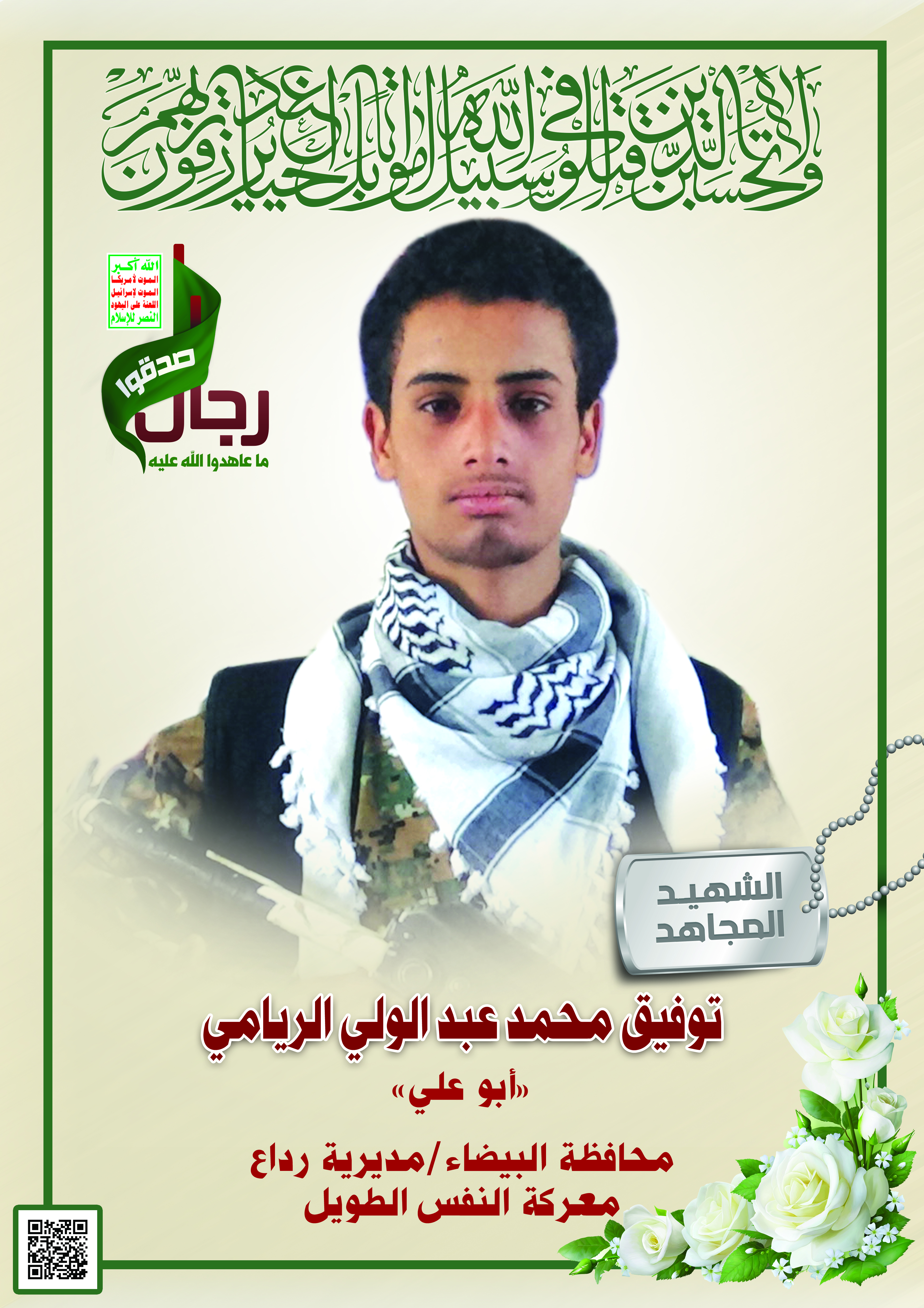 Actor توفيق محمد عبدالولي محمد صالح الريامي Filmography الشهيد المجاهد: توفيق محمد عبدالولي محمد صالح الريامي – أبو علي المحافظة: البيضاء المديرية: رداع ريام – معركة النفس الطويل رقم الحافظة: 130373 FILMOGRAPHY icon وصايا الخالدين – الشهيد توفيق محمد عبدالولي محمد صالح الريامي – ابو علي 12/11/2024 12/11/2024