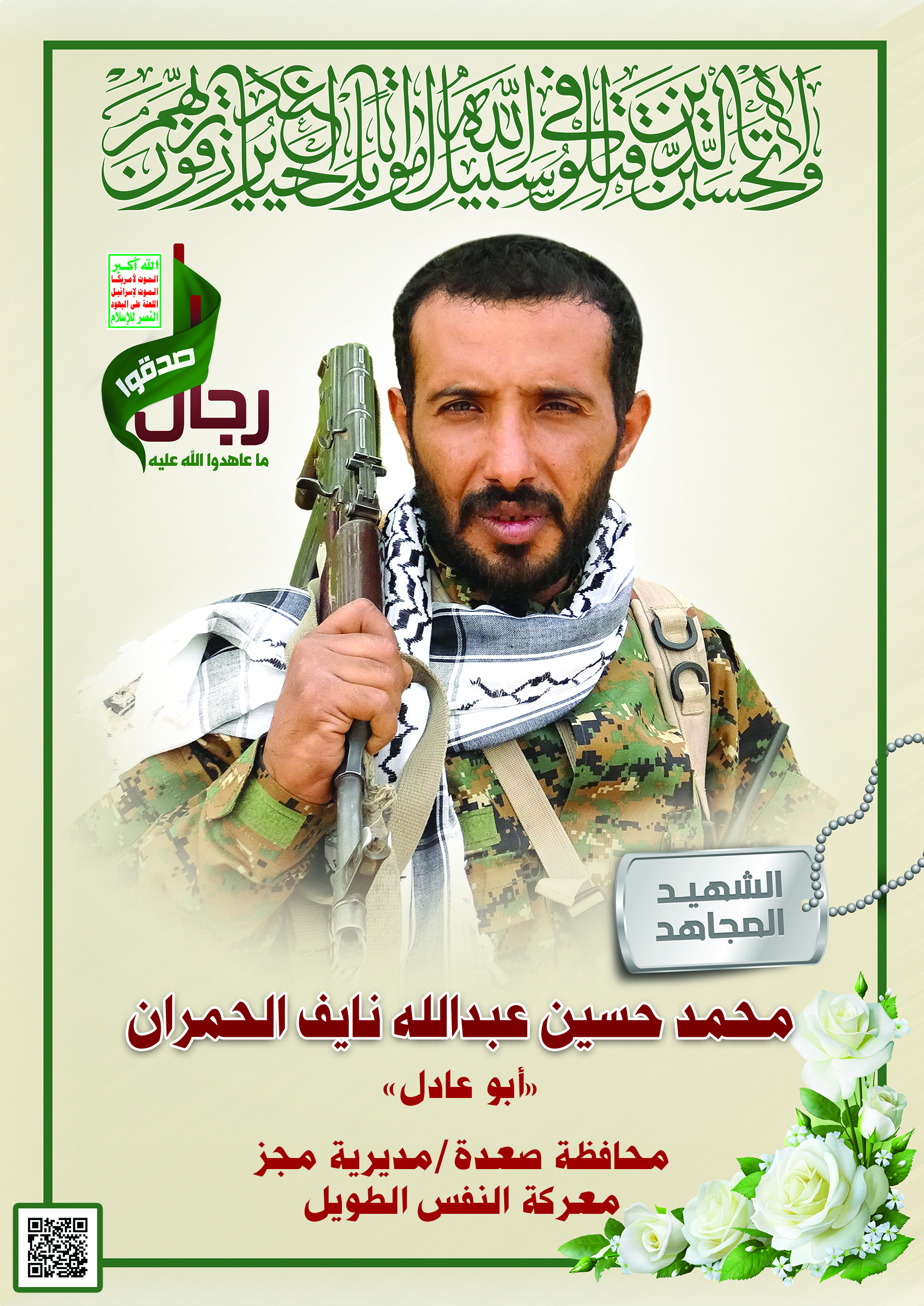 Actor محمد حسين عبدالله علي نايف الحمران Filmography الشهيد المجاهد: محمد حسين عبدالله علي نايف الحمران – أبو عادل المحافظة: صعدة المديرية: مجز – ضحيان معركة النفس الطويل رقم الحافظة: 131302