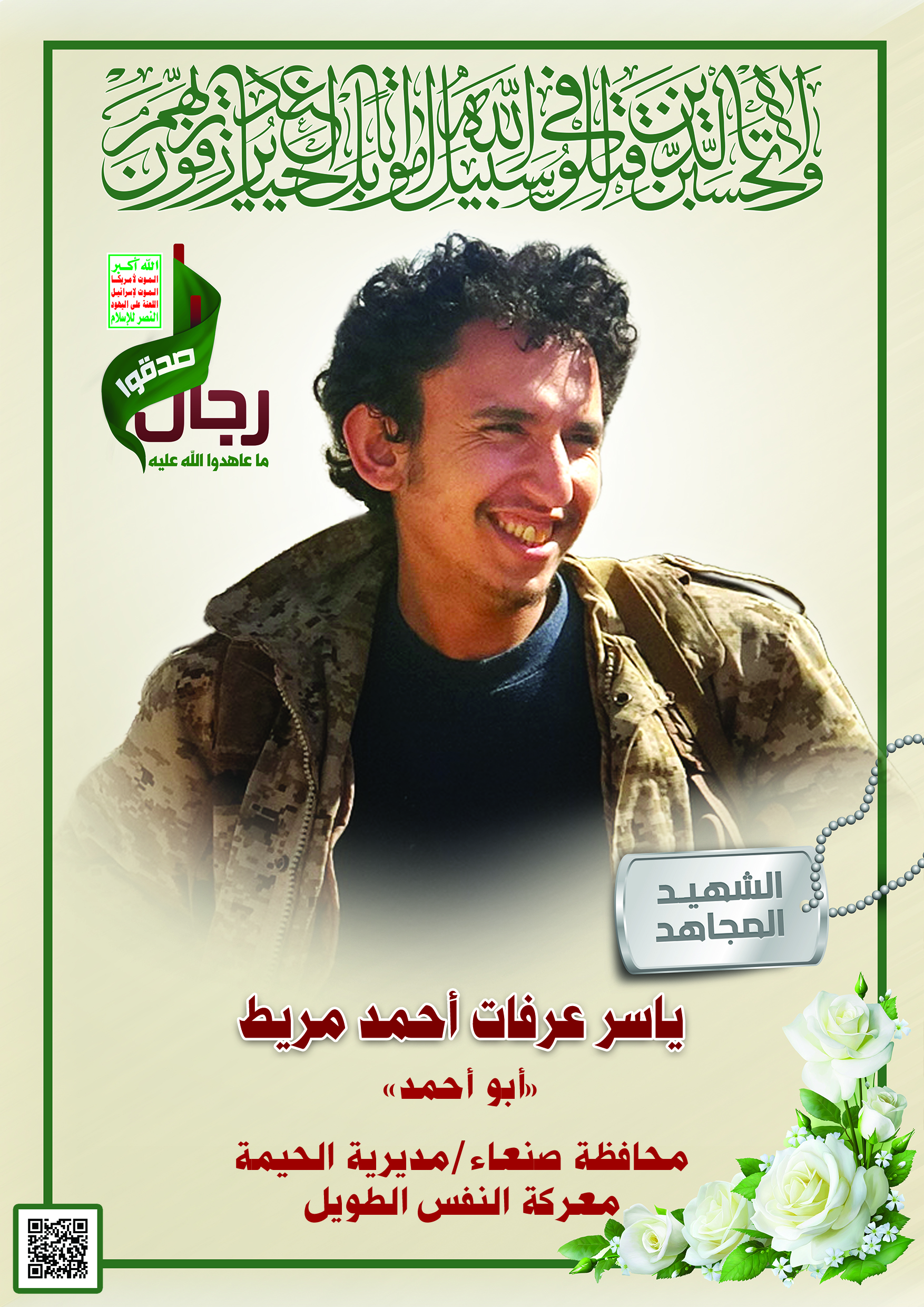 Actor ياسر عرفات أحمد احمد مريط Filmography الشهيد المجاهد: ياسر عرفات أحمد احمد مريط – أبو أحمد المحافظة: صنعاء المديرية: الحيمة – معركة النفس الطويل رقم الحافظة: 131634 FILMOGRAPHY icon وصايا الخالدين || الشهيد/ياسر عرفات أحمد مريط (أبو أحمد) 07/02/2023