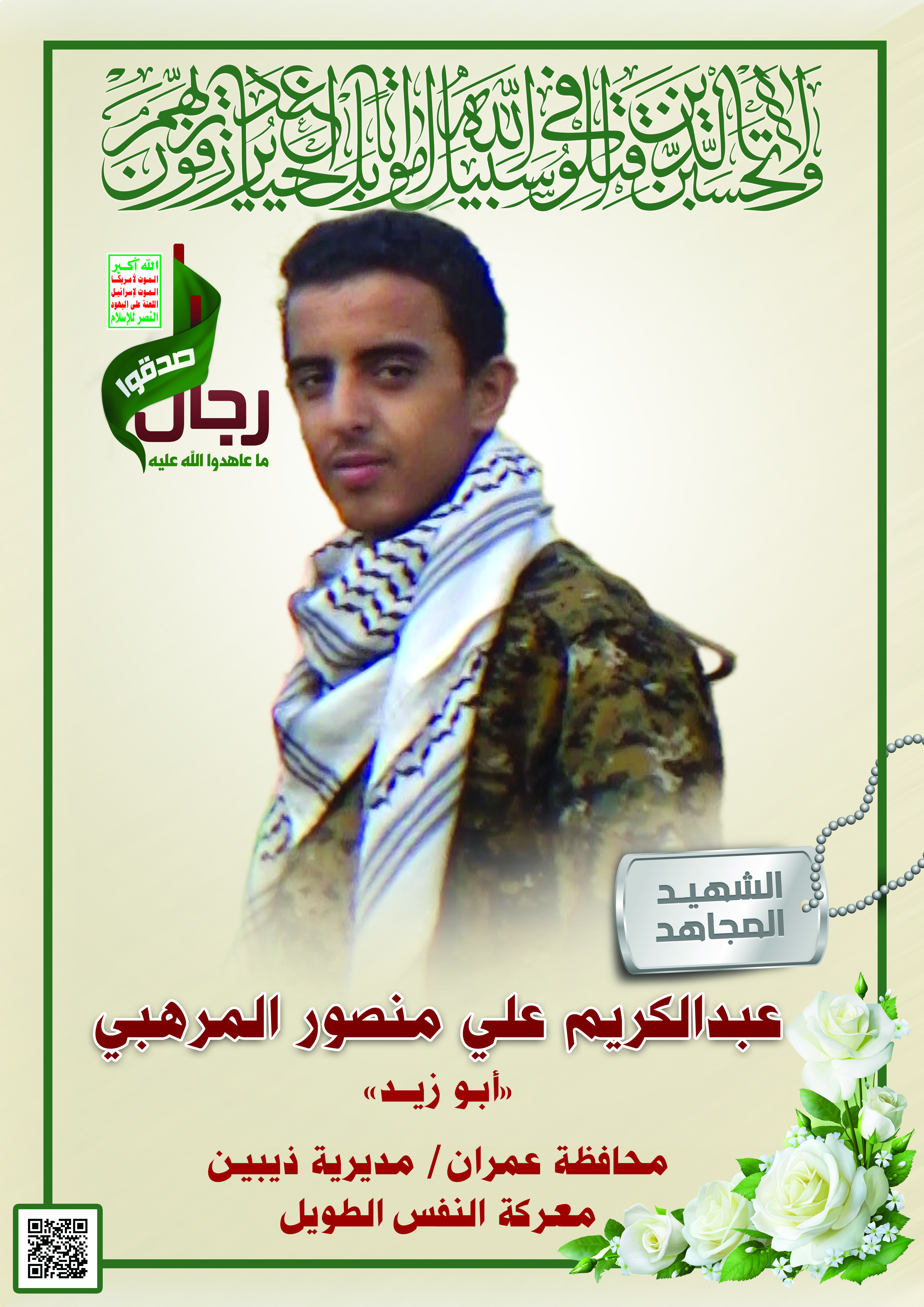 Actor عبدالكريم علي منصور محمد ضبعان المرهبي Filmography الشهيد المجاهد: عبدالكريم علي منصور محمد ضبعان المرهبي – أبو زيد المحافظة: عمران المديرية: ذيبين مرهبة – معركة النفس الطويل رقم الحافظة: 131722