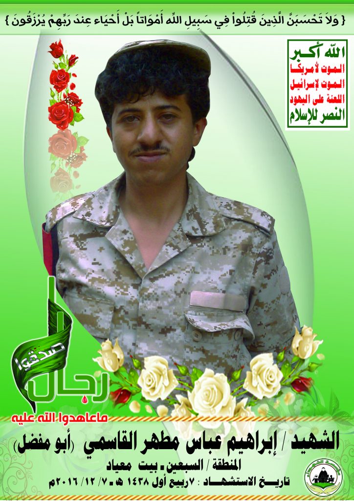 Actor إبراهيم عباس مطهر أحمد يحيى القاسمي Filmography الشهيد المجاهد: إبراهيم عباس مطهر أحمد يحيى القاسمي – أبو مفضل المحافظة: الأمانة المديرية: السبعين – بيت معياد معركة النفس الطويل رقم الحافظة: 131825