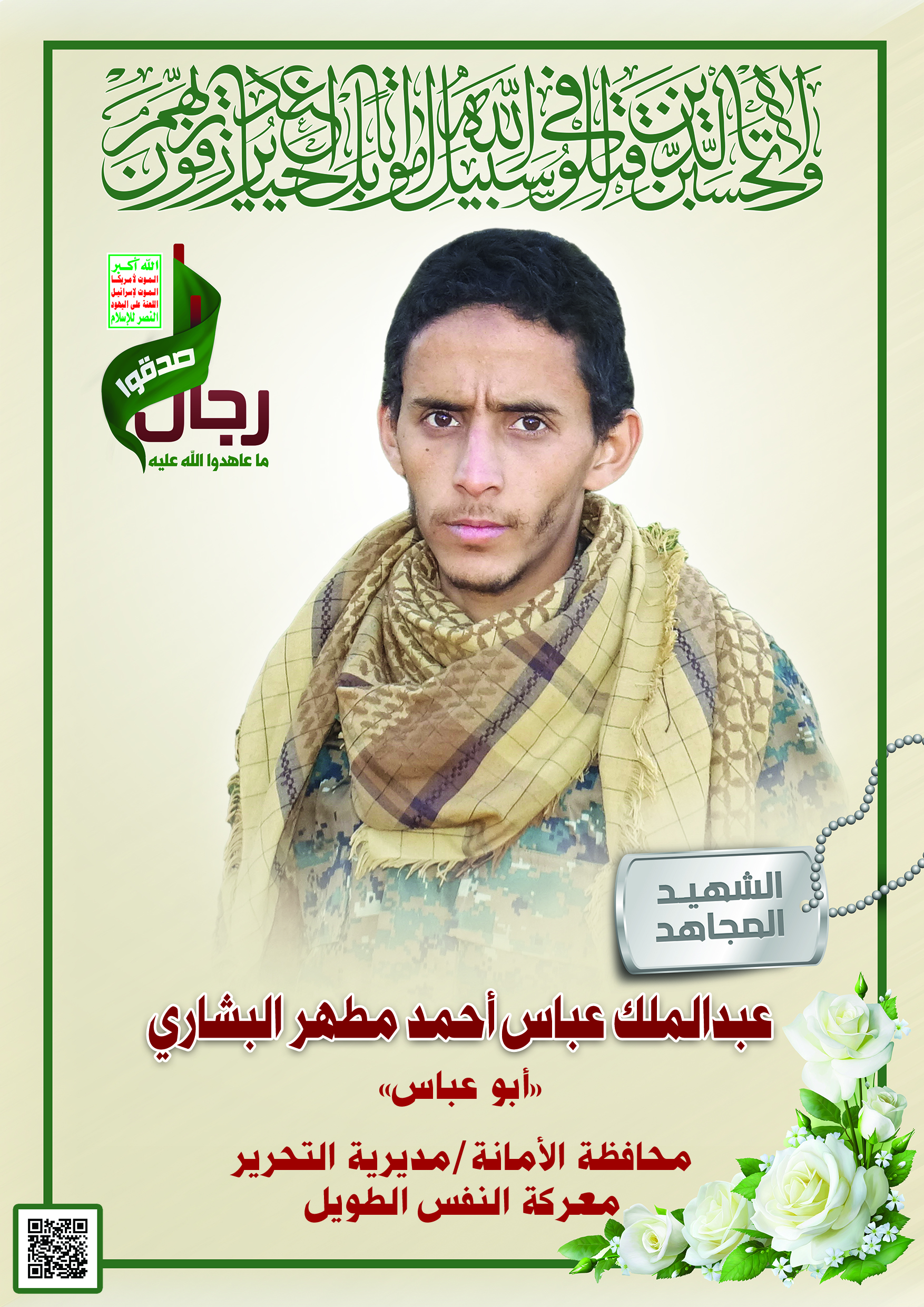 Actor عبدالملك عباس أحمد مطهر أحمد البشاري Filmography الشهيد المجاهد: عبدالملك عباس أحمد مطهر أحمد البشاري – أبو عباس المحافظة: الأمانة المديرية: التحرير – حي الكويت معركة النفس الطويل رقم الحافظة: 132038 FILMOGRAPHY icon وصايا الخالدين || الشهيد/ عبدالملك عباس أحمد البشاري (أبو عباس) 03/08/2022