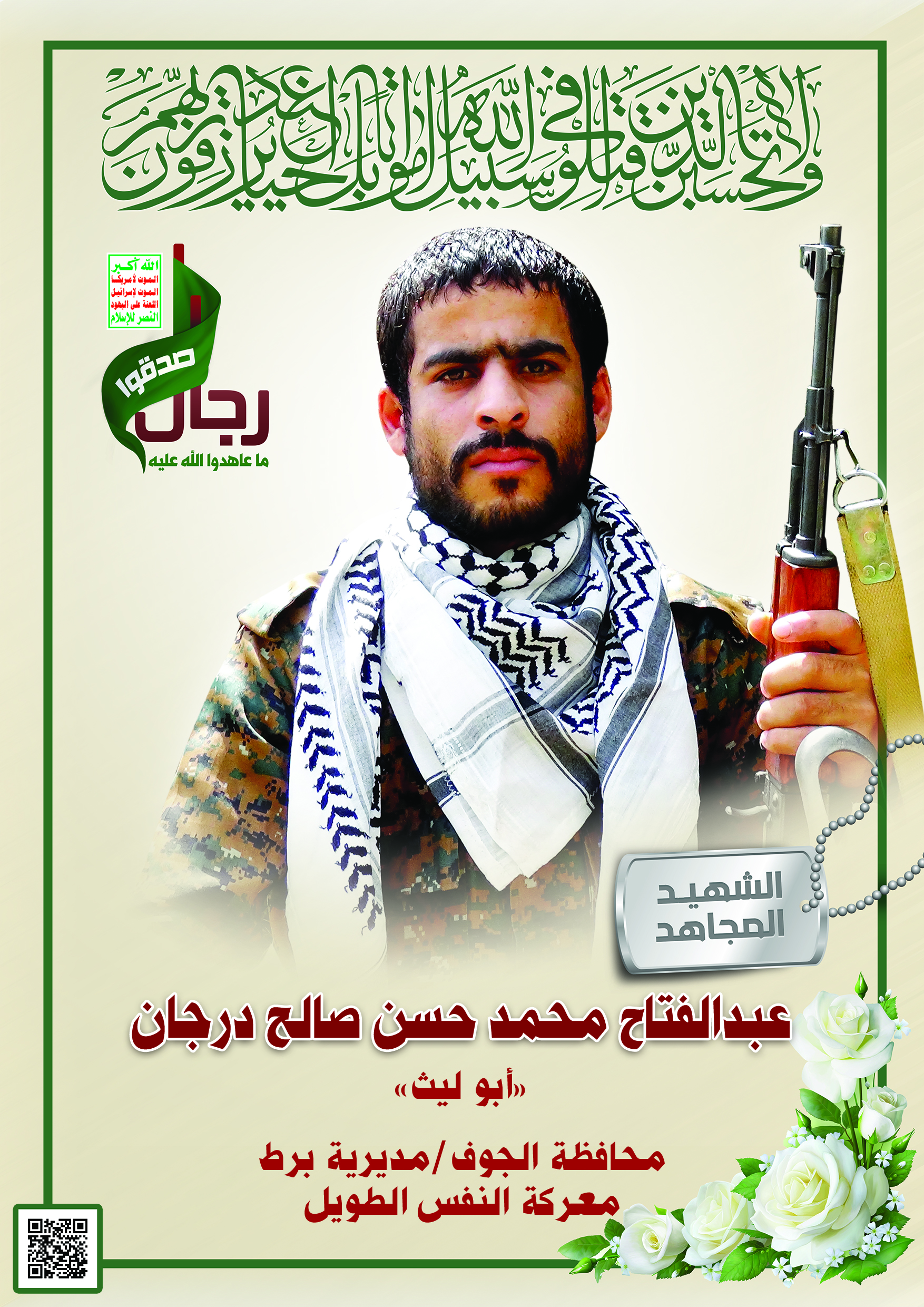 Actor عبدالفتاح محمد حسن صالح محمد درجان Filmography الشهيد المجاهد: عبدالفتاح محمد حسن صالح محمد درجان – أبو ليث المحافظة: الجوف المديرية: برط – معركة النفس الطويل رقم الحافظة: 132354
