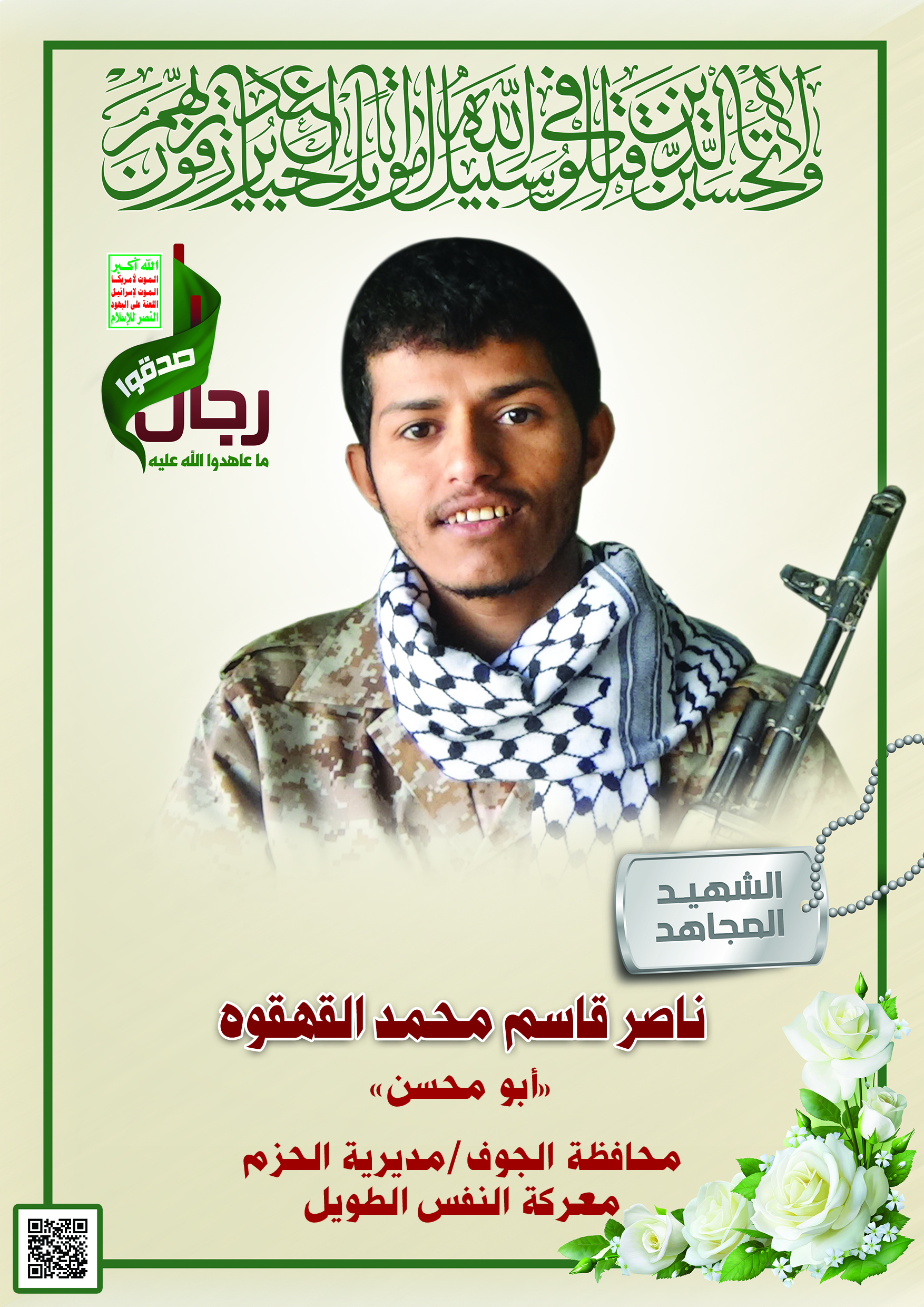 Actor ناصر قاسم محمد محسن محمد القهقوه Filmography الشهيد المجاهد: ناصر قاسم محمد محسن محمد القهقوه – أبو محسن المحافظة: الجوف المديرية: الحزم – معركة النفس الطويل رقم الحافظة: 132414 FILMOGRAPHY icon لكم الخلود || الشهيد/ ناصر قاسم محمد محسن محمد القهقوه (أبو محسن) 11/11/2021 24/11/2021