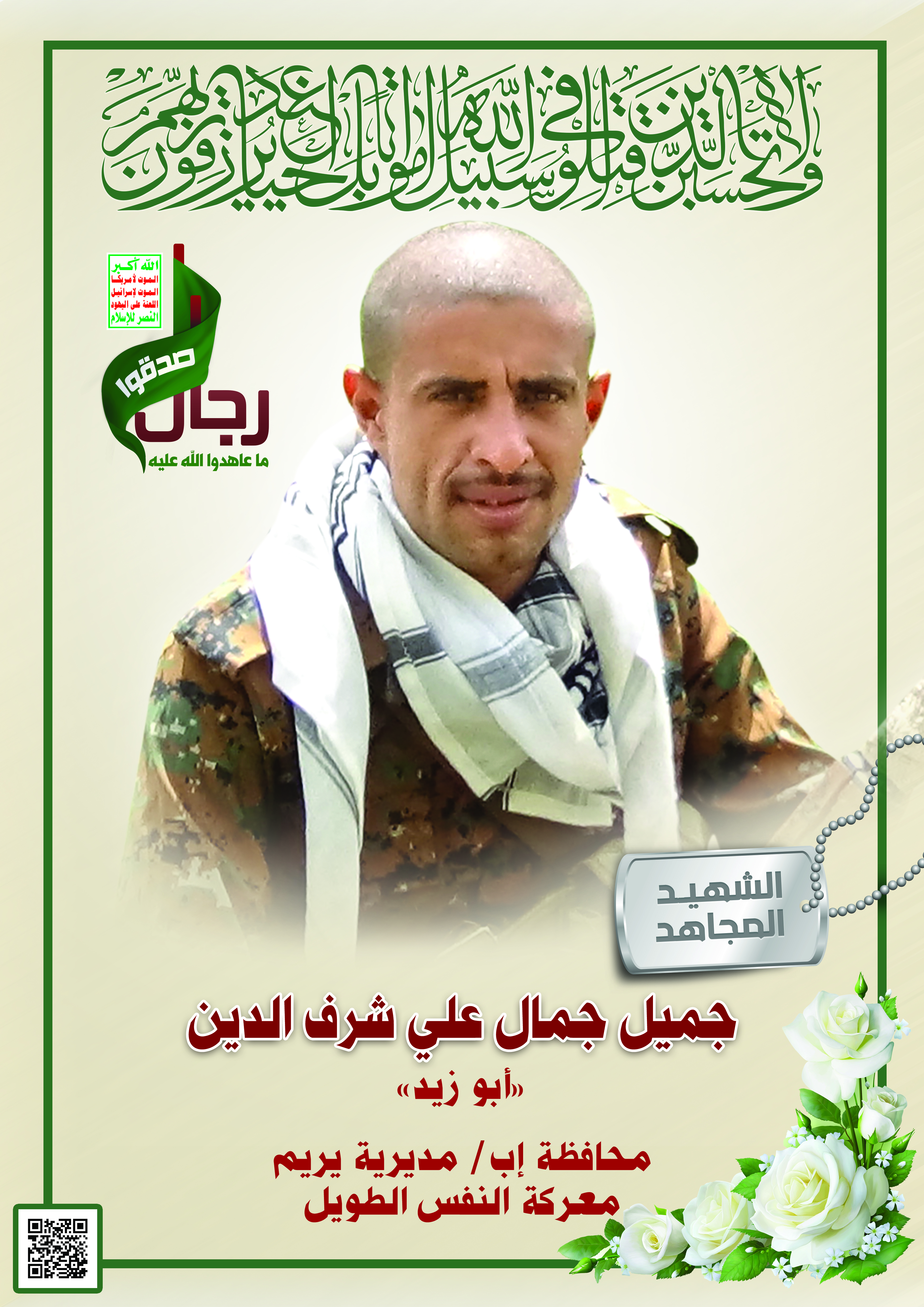 Actor جميل جمال علي يحيى شرف الدين Filmography الشهيد المجاهد: جميل جمال علي يحيى شرف الدين – أبو زيد المحافظة: إب المديرية: يريم – بني منبة معركة النفس الطويل رقم الحافظة: 133219