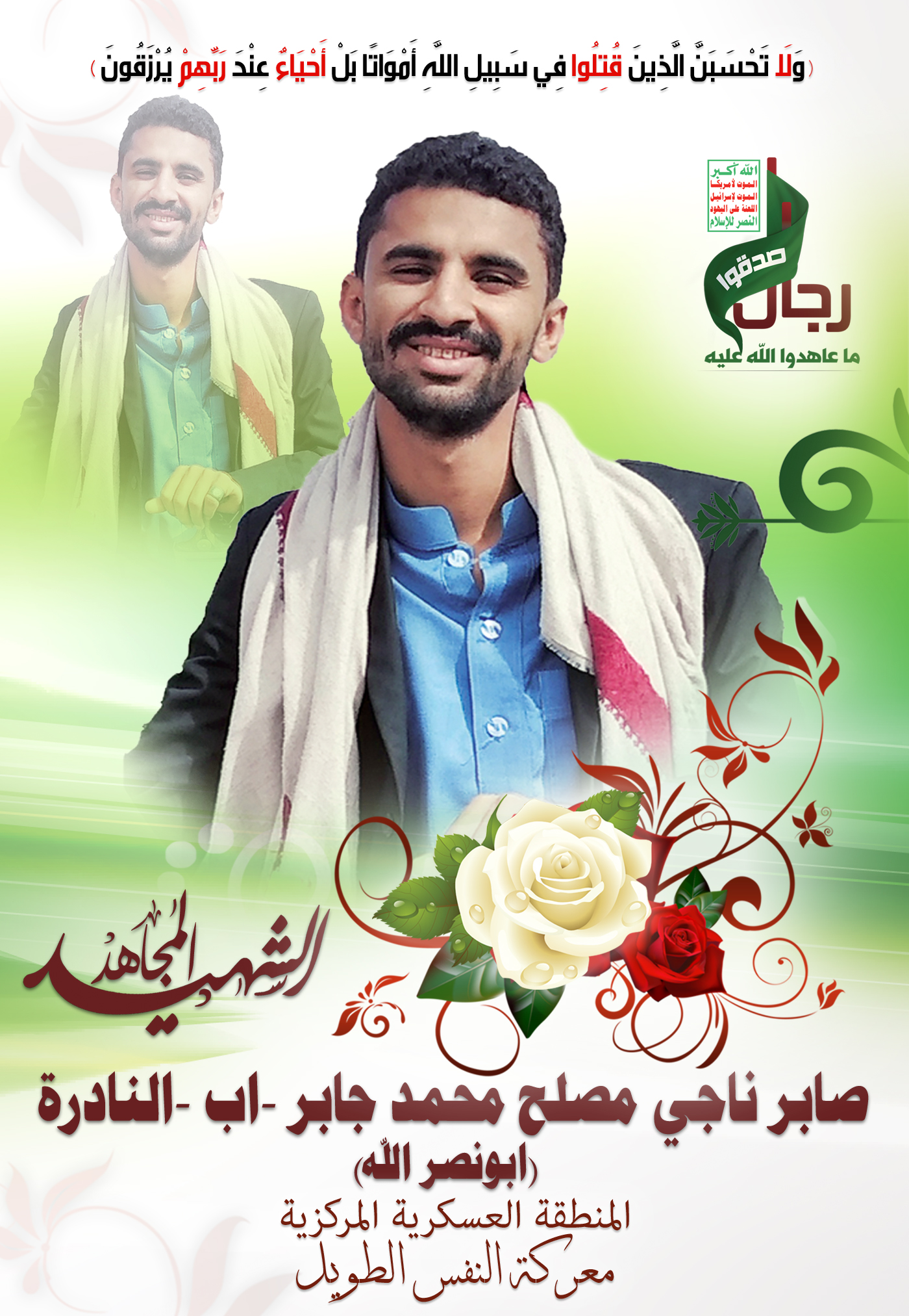 Actor صابر ناجي مصلح محمد عبدالله جابر Filmography الشهيد المجاهد: صابر ناجي مصلح محمد عبدالله جابر – أبو نصرالله المحافظة: إب المديرية: النادرة – معركة النفس الطويل رقم الحافظة: 133344