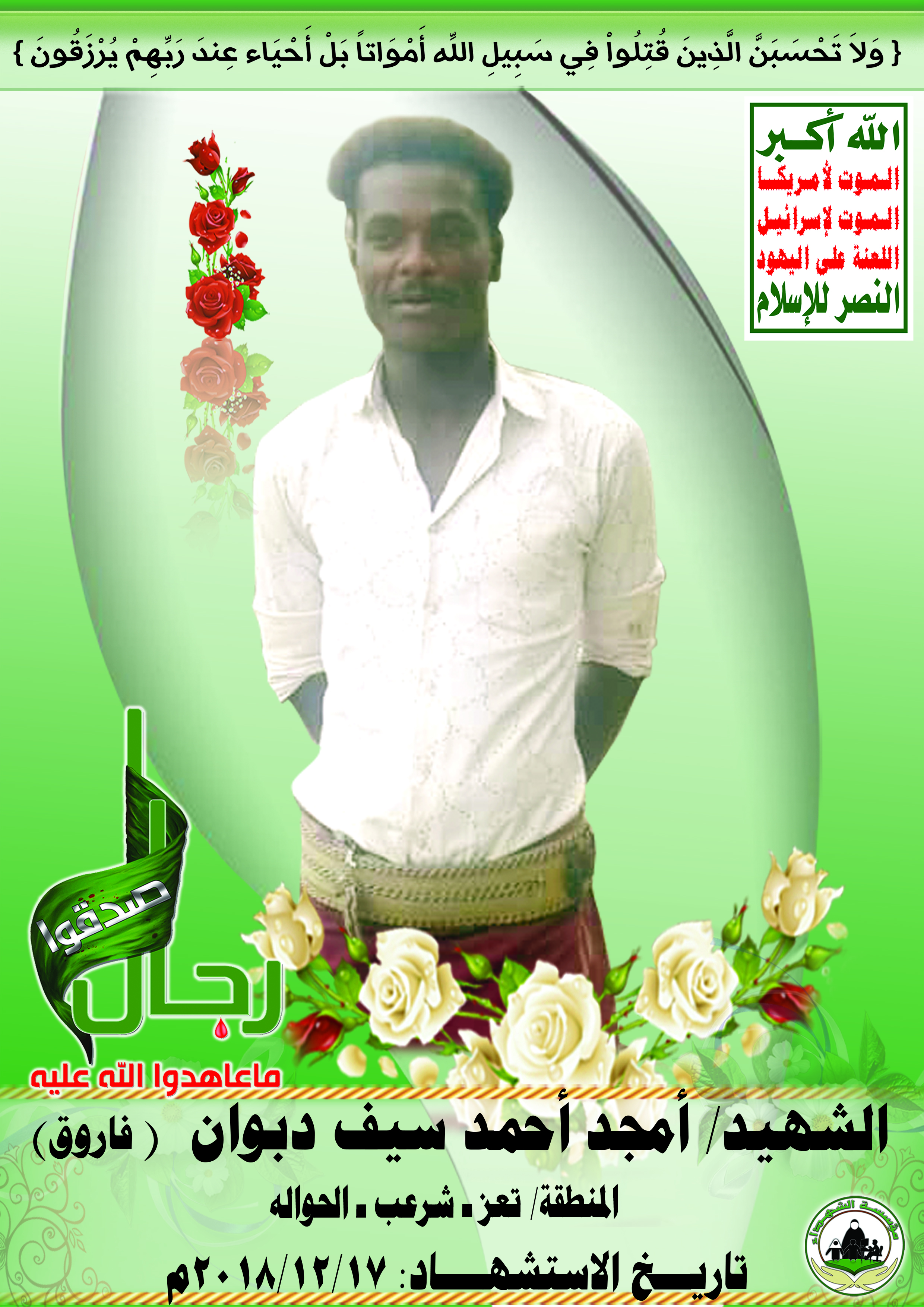 Actor أمجد أحمد سيف دبوان علي الشرعبي Filmography الشهيد المجاهد: أمجد أحمد سيف دبوان علي الشرعبي – أبو فاروق المحافظة: تعز المديرية: شرعب الرونة – معركة النفس الطويل رقم الحافظة: 133769