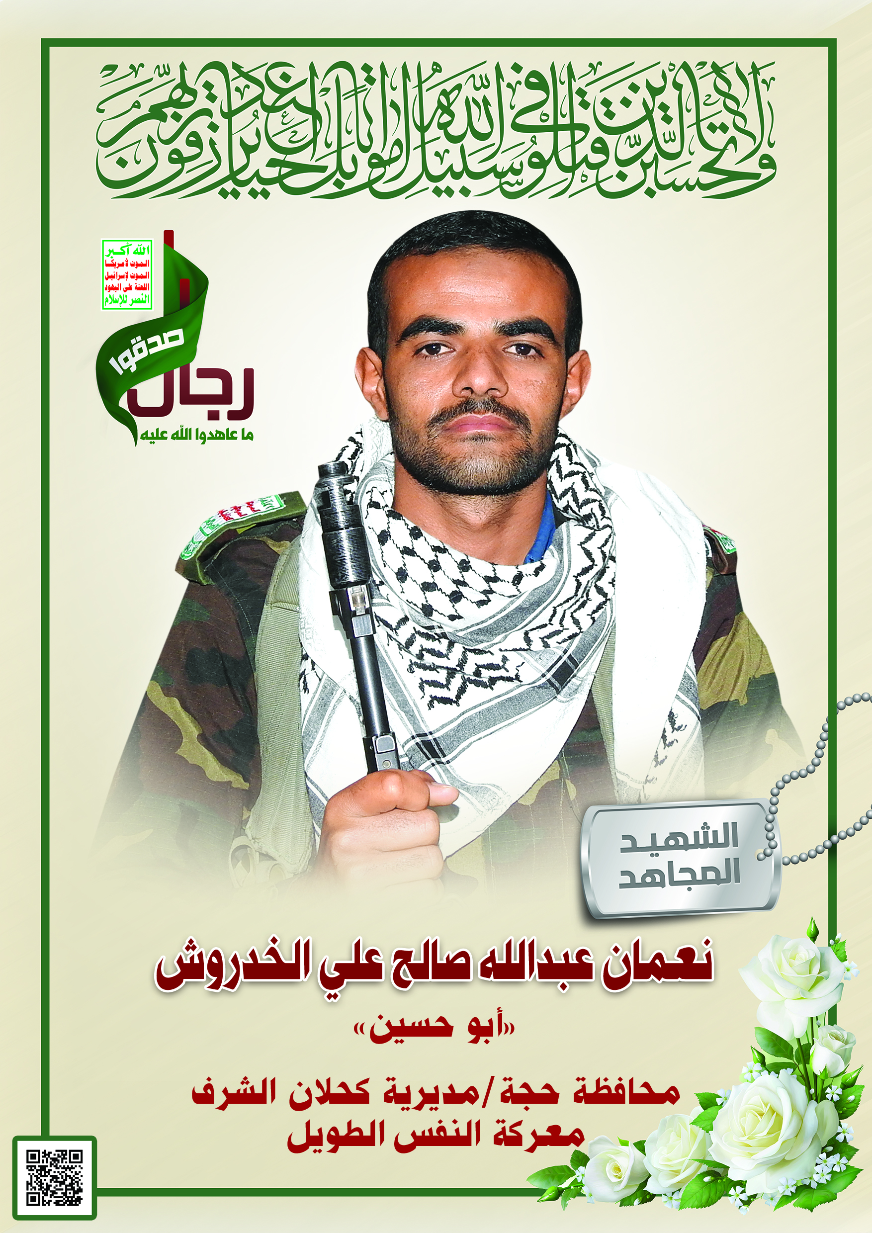 Actor نعمان عبدالله صالح علي جعدان الخدروش Filmography الشهيد المجاهد: نعمان عبدالله صالح علي جعدان الخدروش – أبو حسين المحافظة: حجة المديرية: كحلان الشرف – افصر معركة النفس الطويل رقم الحافظة: 135221