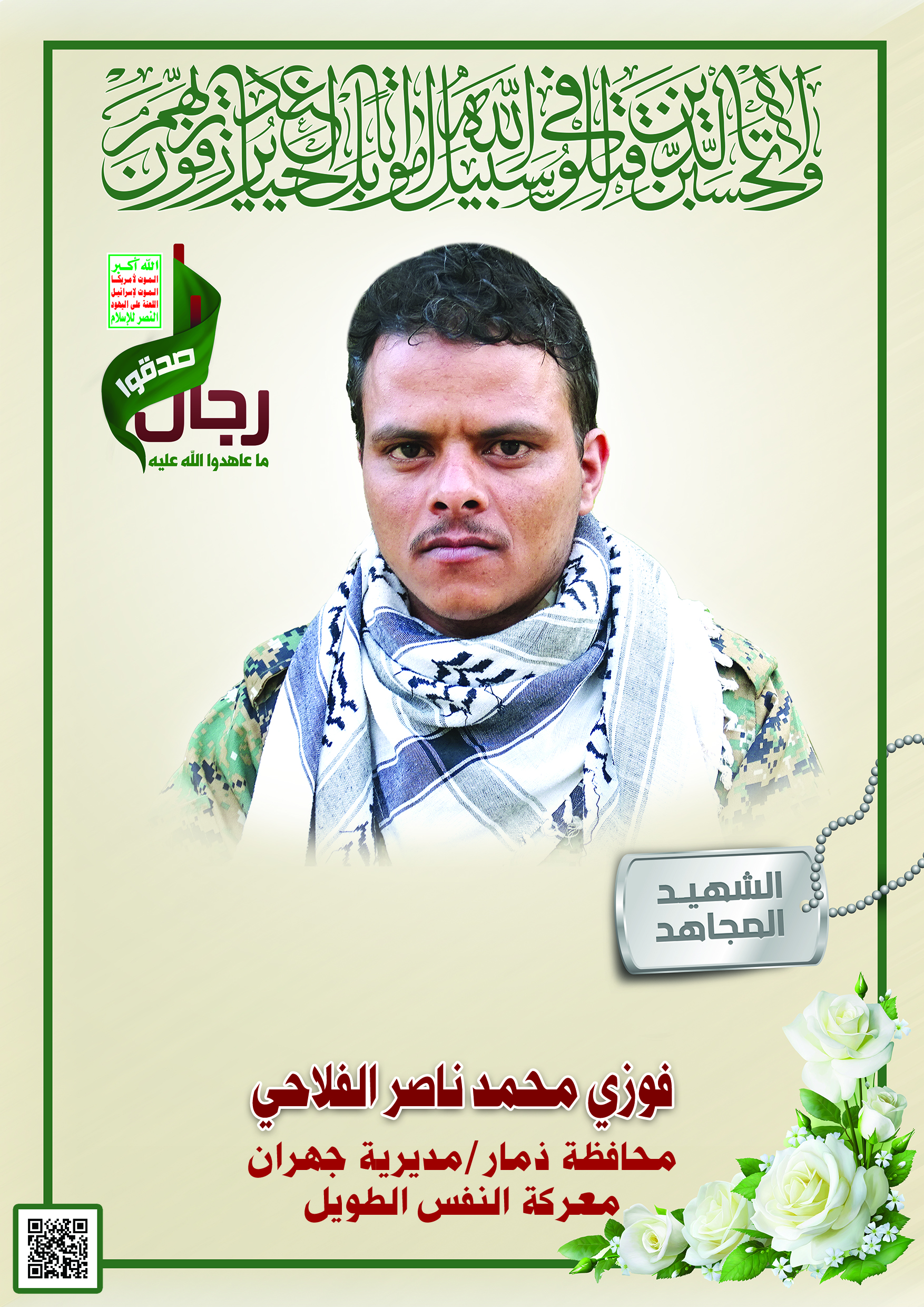 Actor فوزي محمد ناصر أحمد علي الفلاحي Filmography الشهيد المجاهد: فوزي محمد ناصر أحمد علي الفلاحي – المحافظة: ذمار المديرية: جهران – بني فلاح معركة النفس الطويل رقم الحافظة: 136034 FILMOGRAPHY icon لكم الخلود || الشهيد/ فوزي محمد الفلاحي (أبو عادل) 17/06/2022