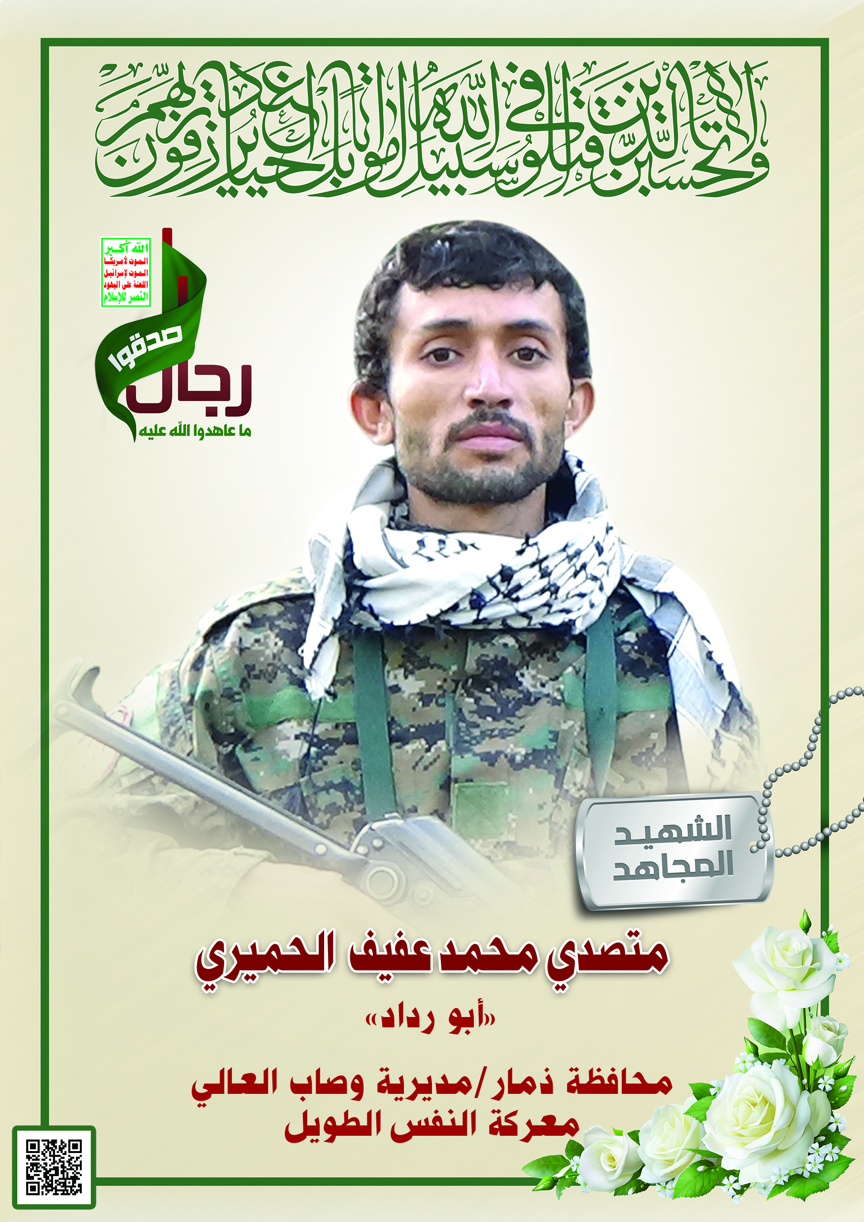 Actor متصدي محمد عفيف راشد قائد الحميري Filmography الشهيد المجاهد: متصدي محمد عفيف راشد قائد الحميري – أبو رداد المحافظة: ذمار المديرية: وصاب العالي – حمير معركة النفس الطويل رقم الحافظة: 136082