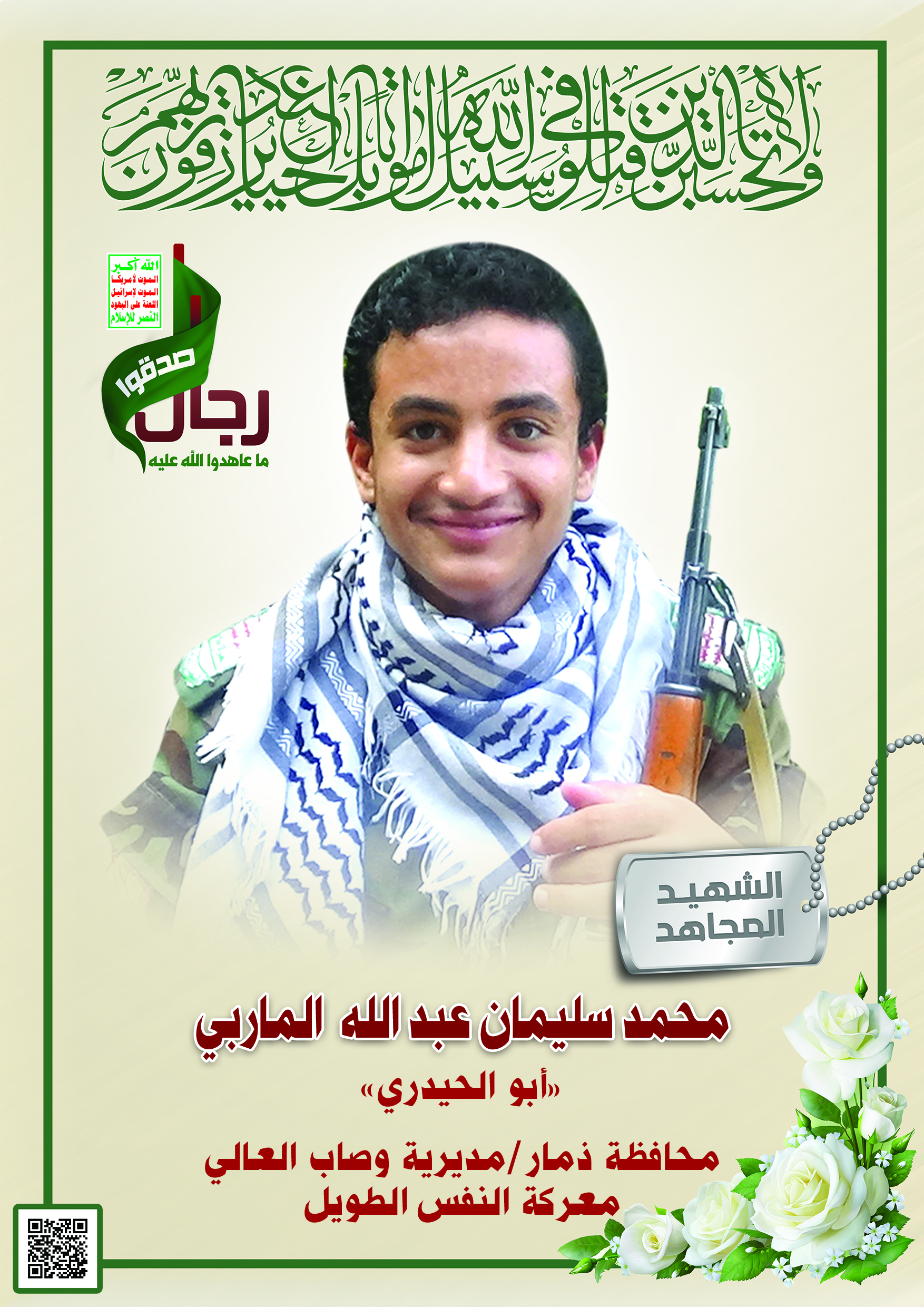 Actor محمد سليمان عبدالله محمد فارع المأربي Filmography الشهيد المجاهد: محمد سليمان عبدالله محمد فارع المأربي – أبو الحيدري المحافظة: ذمار المديرية: وصاب العالي – الحرف معركة النفس الطويل رقم الحافظة: 136129