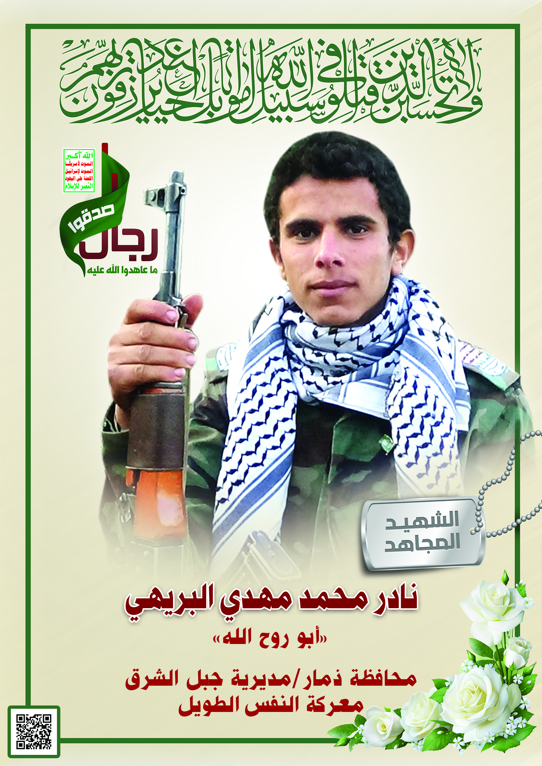 Actor نادر محمد مهدي صالح حسين البريهي Filmography الشهيد المجاهد: نادر محمد مهدي صالح حسين البريهي – أبو روح الله المحافظة: ذمار المديرية: جبل الشرق – معركة النفس الطويل رقم الحافظة: 136232