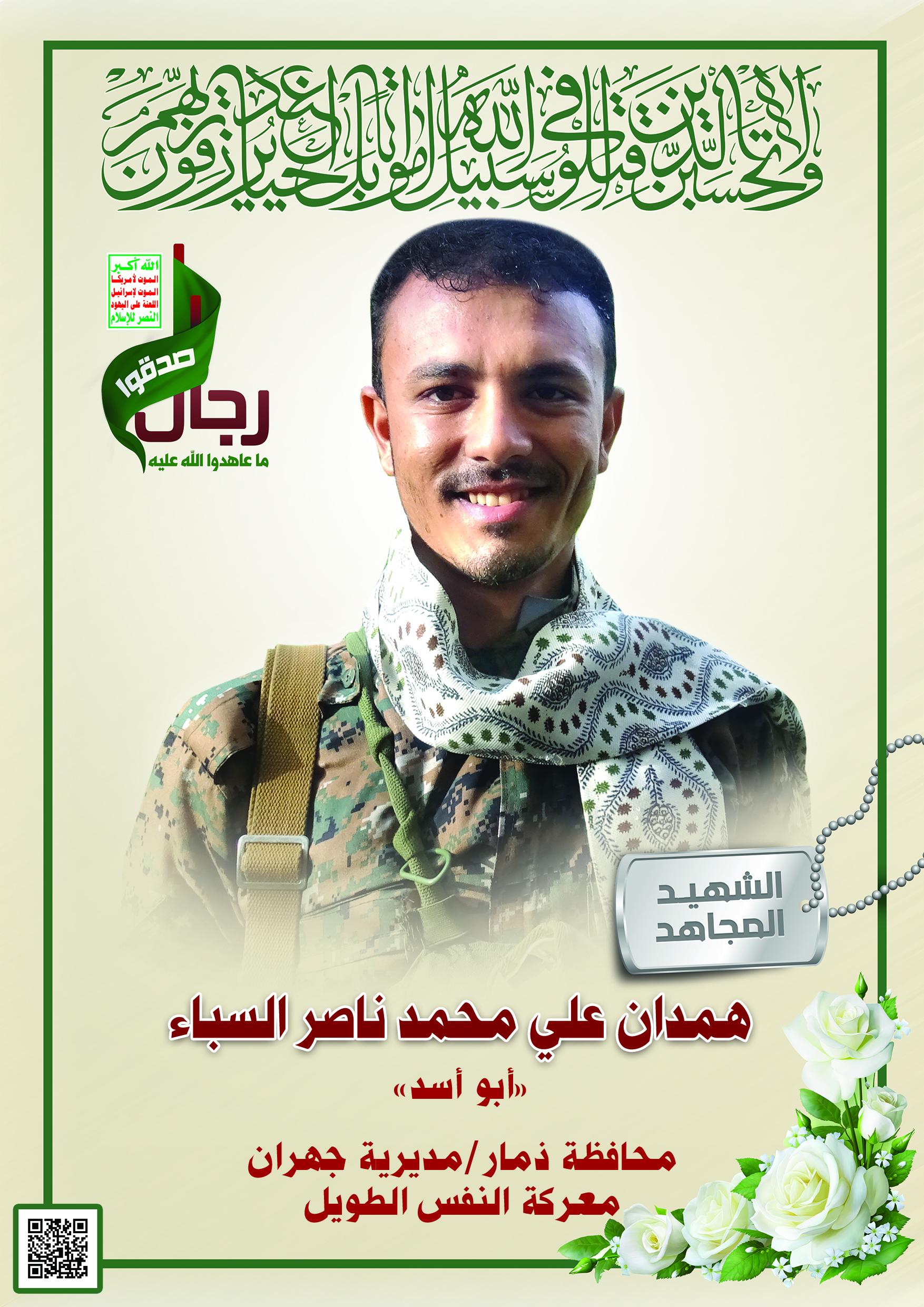Actor همدان علي محمد ناصر عبدالله السباء Filmography الشهيد المجاهد: همدان علي محمد ناصر عبدالله السباء – أبو أسد المحافظة: ذمار المديرية: جهران – بني سباء معركة النفس الطويل رقم الحافظة: 136282