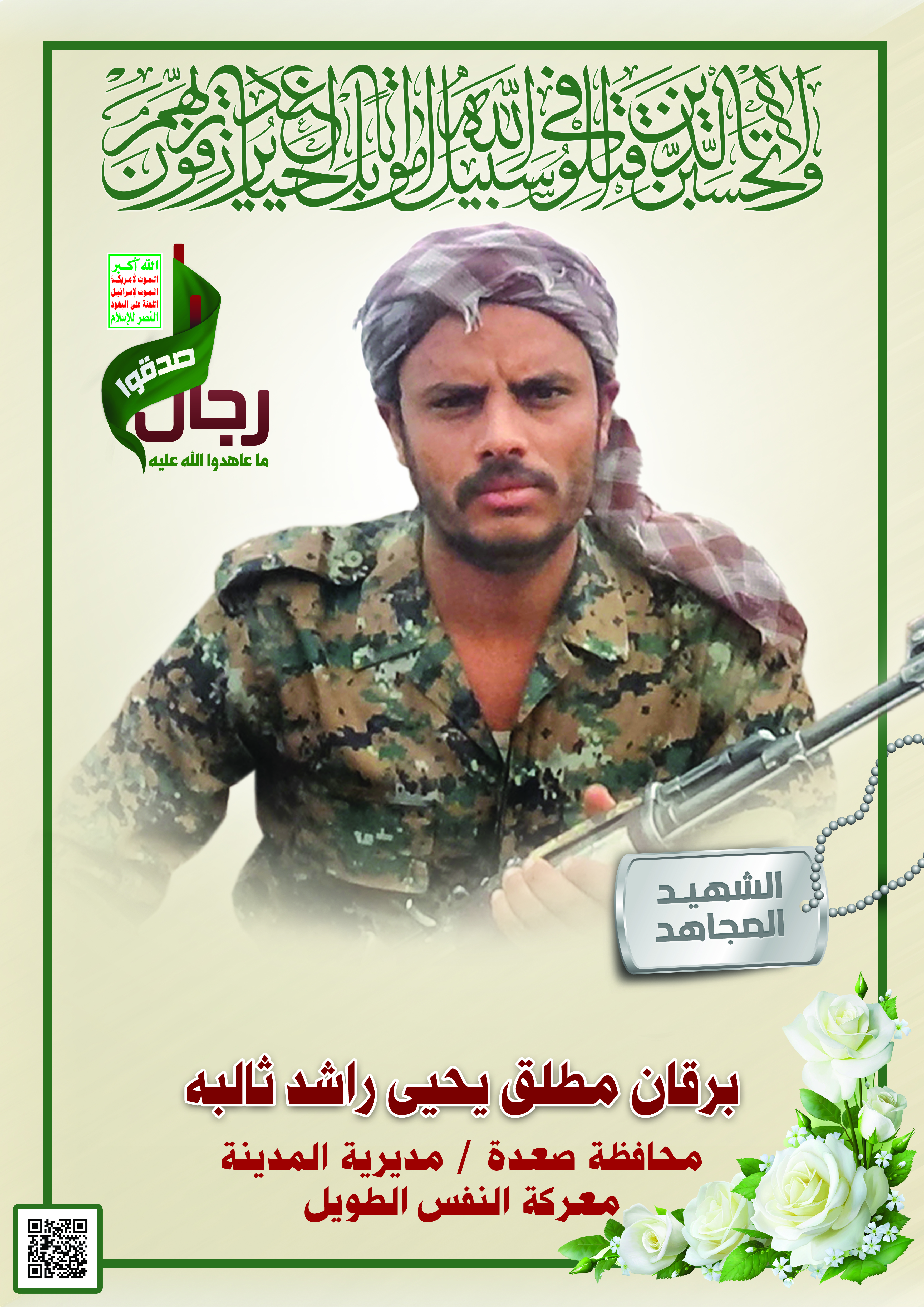 Actor برقان مطلق يحيى راشد عيضة ثالبه Filmography الشهيد المجاهد: برقان مطلق يحيى راشد عيضة ثالبه – المحافظة: صعدة المديرية: – معركة النفس الطويل رقم الحافظة: 136566 FILMOGRAPHY icon عظمة العطاء – الشهيد برقان مطلق يحيى راشد عيضه ثالبة ( أبو برقان ) 18/04/2021 25/11/2021