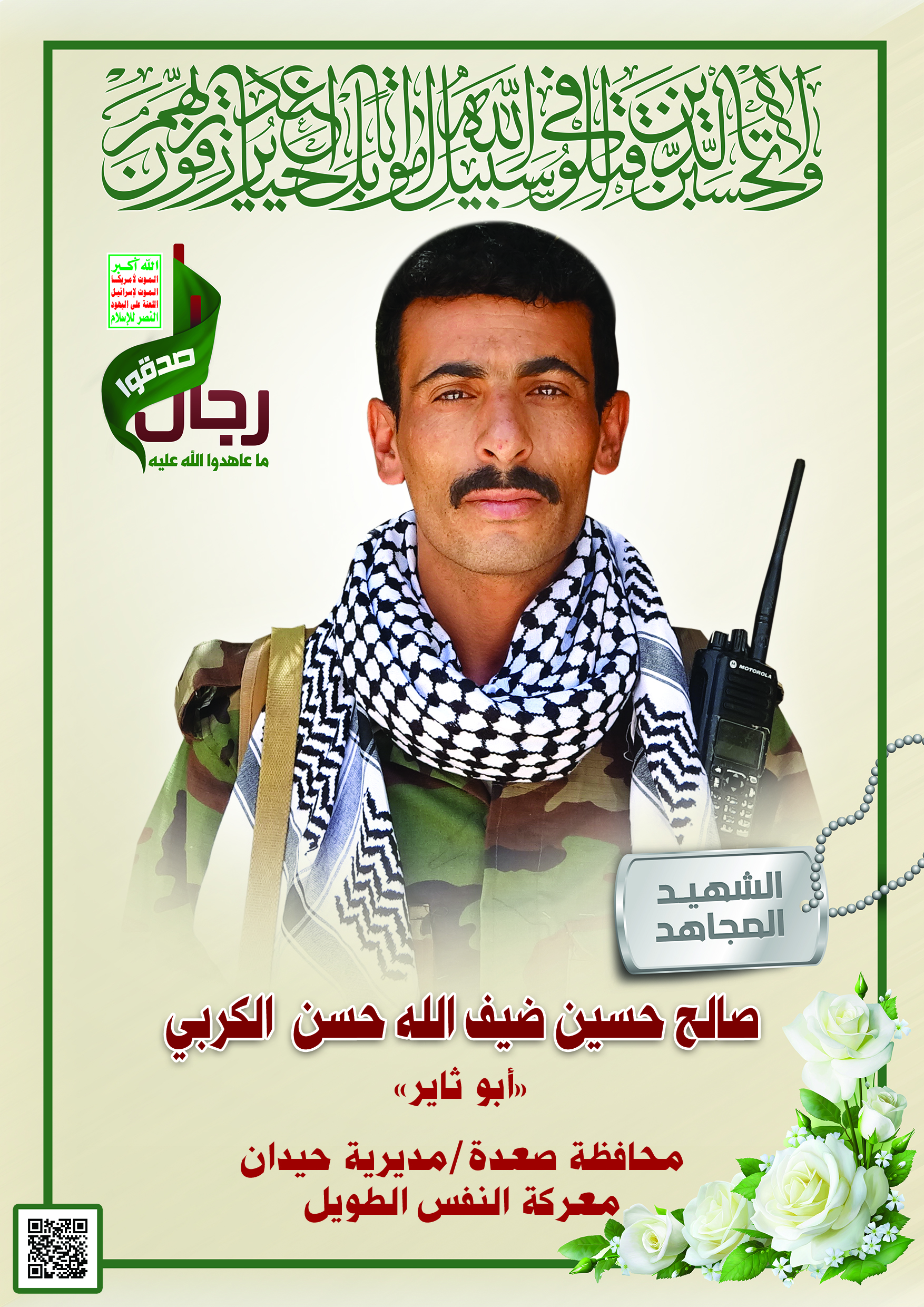 Actor صالح حسين ضيف الله حسن هادي الكربي Filmography الشهيد المجاهد: صالح حسين ضيف الله حسن هادي الكربي – أبو ثاير المحافظة: صعدة المديرية: حيدان – الصافية معركة النفس الطويل رقم الحافظة: 136793