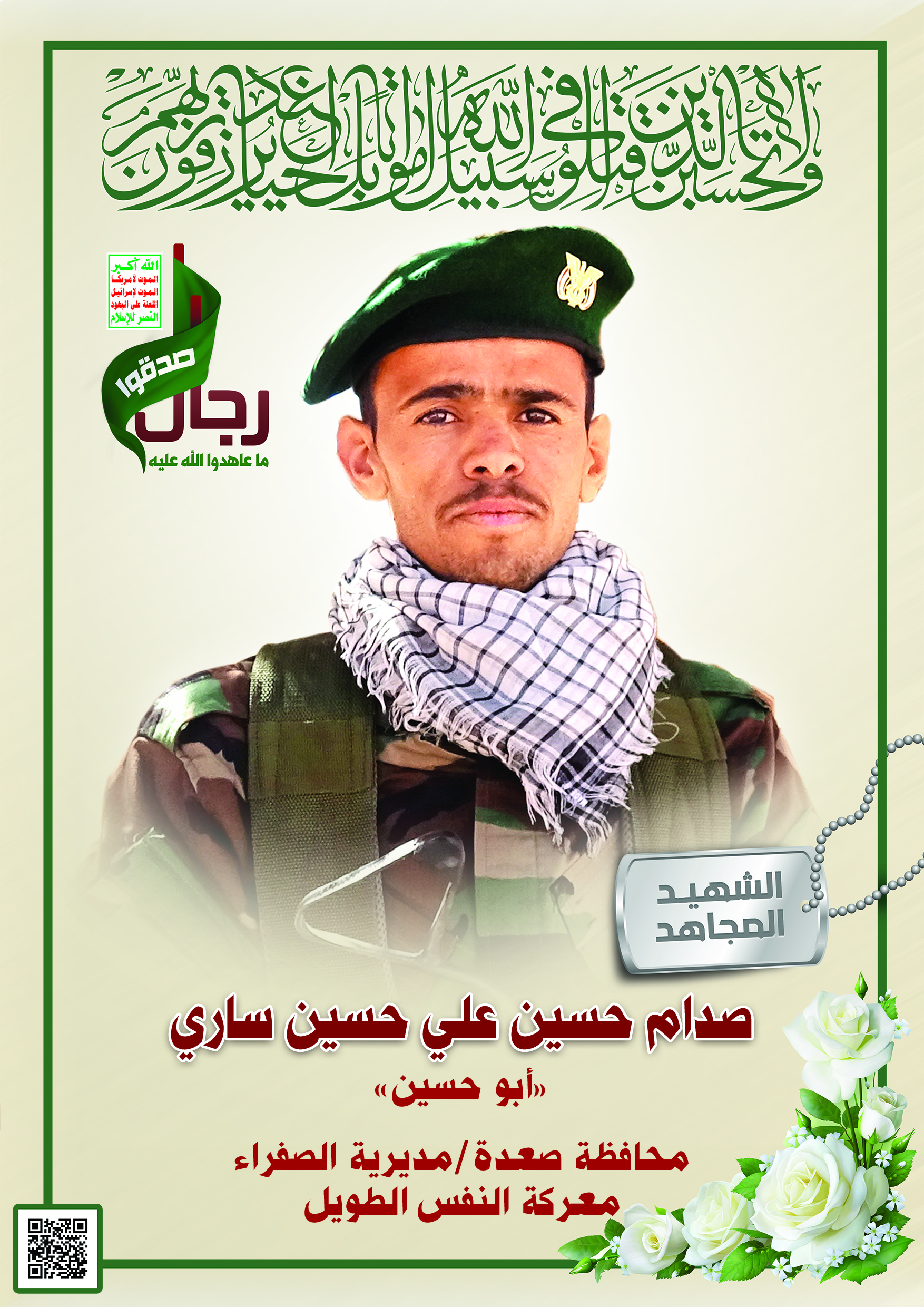 Actor صدام حسين علي حسين علي ساري Filmography الشهيد المجاهد: صدام حسين علي حسين علي ساري – أبو حسين المحافظة: صعدة المديرية: الصفراء – نشور معركة النفس الطويل رقم الحافظة: 136810 FILMOGRAPHY icon وصايا الخالدين الشهيد – صدام حسين علي حسين ساري (ابو حسين) 29/11/2023 29/11/2023